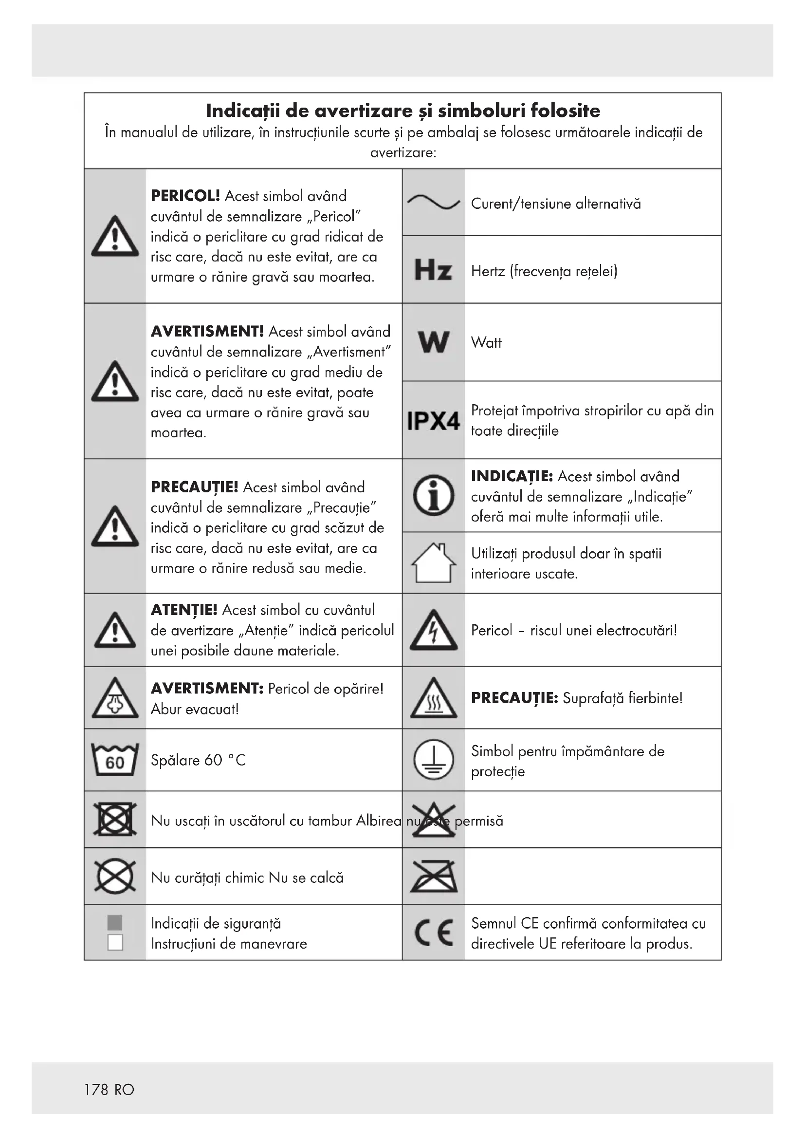 Indicații de avertizare și simboluri folosite În manualul de utilizare, în instrucțiunile scurte și pe ambalaj se folosesc următoarele indicații de avertizare: PERICOL! Acest simbol având cuvântul de semnalizare „Pericol” indică o periclitare cu grad ridicat de risc care, dacă nu este evitat, are ca urmare o rănire gravă sau moartea. Curent/tensiune alternativă Hertz (frecvența rețelei) AVERTISMENT! Acest simbol având cuvântul de semnalizare „Avertisment” indică o periclitare cu grad mediu de risc care, dacă nu este evitat, poate avea ca urmare o rănire gravă sau moartea. Watt Protejat împotriva stropirilor cu apă din toate direcțiile PRECAUȚIE! Acest simbol având cuvântul de semnalizare „Precauție” indică o periclitare cu grad scăzut de risc care, dacă nu este evitat, are ca urmare o rănire redusă sau medie. INDICAȚIE: Acest simbol având cuvântul de semnalizare „Indicație” oferă mai multe informații utile. Utilizați produsul doar în spatii interioare uscate. ATENȚIE! Acest simbol cu cuvântul de avertizare „Atenție” indică pericolul unei posibile daune materiale. Pericol– riscul unei electrocutări! AVERTISMENT: Pericol de opărire! Abur evacuat! PRECAUȚIE: Suprafață fierbinte! Spălare 60 °C Simbol pentru împământare de protecție Nu uscați în uscătorul cu tambur Albirea nu este permisă Nu curățați chimic Nu se calcă Indicații de siguranță Instrucțiuni de manevrare Semnul CE confirmă conformitatea cu directivele UE referitoare la produs.179