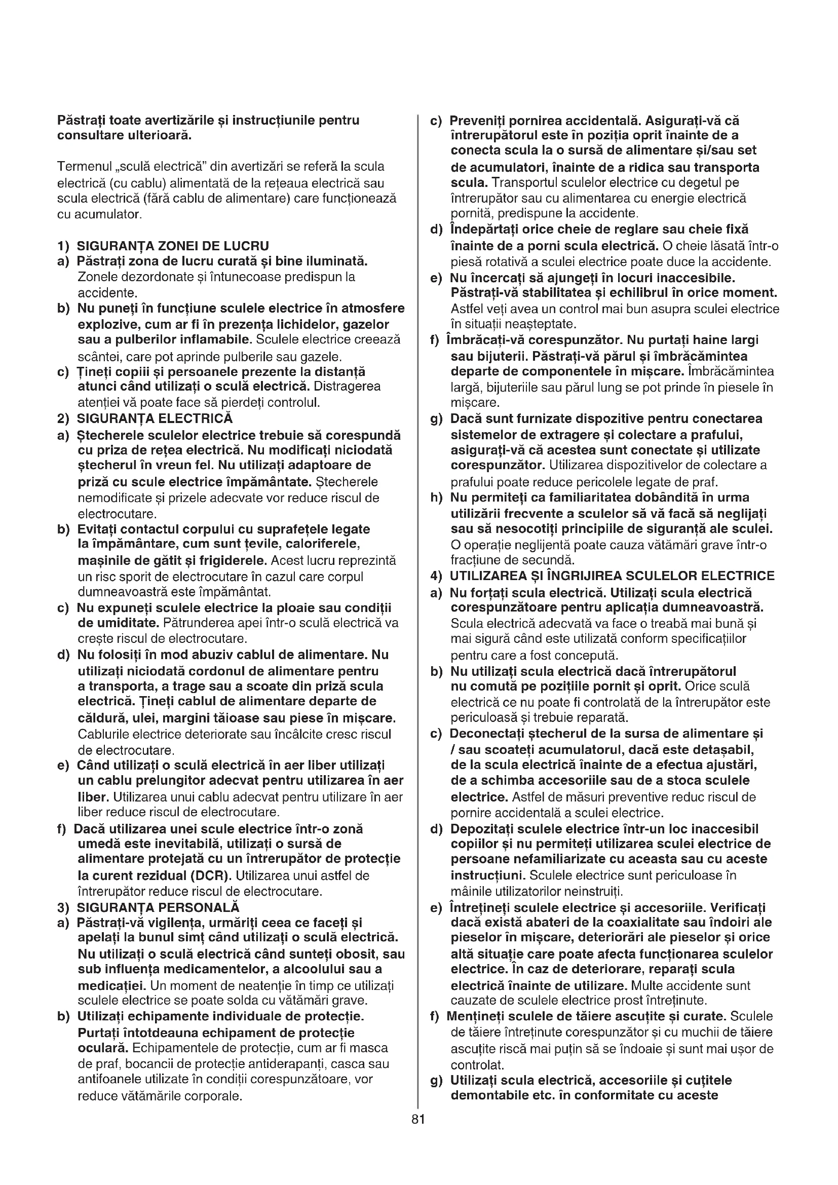 a) Păstraţi-vă vigilenţa, urmăriţi ceea ce faceţi și apelaţi la bunul simţ când utilizaţi o sculă electrică. Nu utilizaţi o sculă electrică când sunteţi obosit, sau sub inuenţa medicamentelor, a alcoolului sau a medicaţiei. Un moment de neatenţie în timp ce utilizaţi sculele electrice se poate solda cu vătămări grave. b) Utilizaţi echipamente individuale de protecţie. Purtaţi întotdeauna echipament de protecţie oculară. Echipamentele de protecţie, cum ar masca de praf, bocancii de protecţie antiderapanţi, casca sau antifoanele utilizate în condiţii corespunzătoare, vor reduce vătămările corporale.82 va instabilă și puteţi pierde controlul asupra ei) ACCESORII
