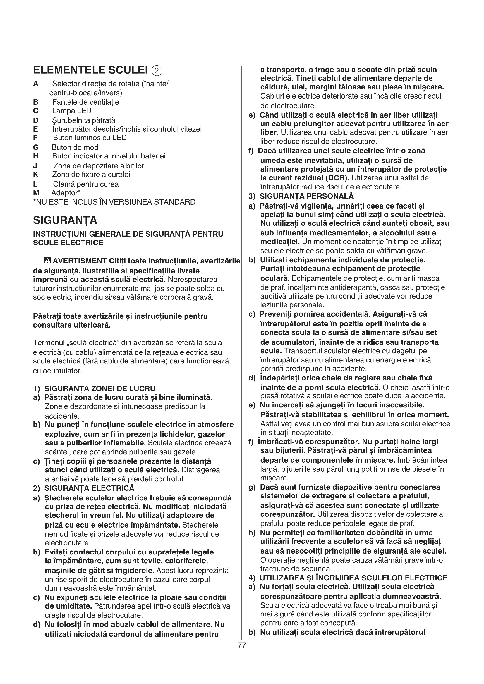 - Μην πετάτε τα ηλεκτρικά εργαλεία, µπαταρίες,77 a transporta, a trage sau a scoate din priză scula electrică. Țineţi cablul de alimentare departe de căldură, ulei, margini tăioase sau piese în mișcare. Cablurile electrice deteriorate sau încâlcite cresc riscul de electrocutare. e) Când utilizaţi o sculă electrică în aer liber utilizaţi un cablu prelungitor adecvat pentru utilizarea în aer liber. Utilizarea unui cablu adecvat pentru utilizare în aer liber reduce riscul de electrocutare. f) Dacă utilizarea unei scule electrice într-o zonă umedă este inevitabilă, utilizaţi o sursă de alimentare protejată cu un întrerupător de protecţie la curent rezidual (DCR). Utilizarea unui astfel de întrerupător reduce riscul de electrocutare.
