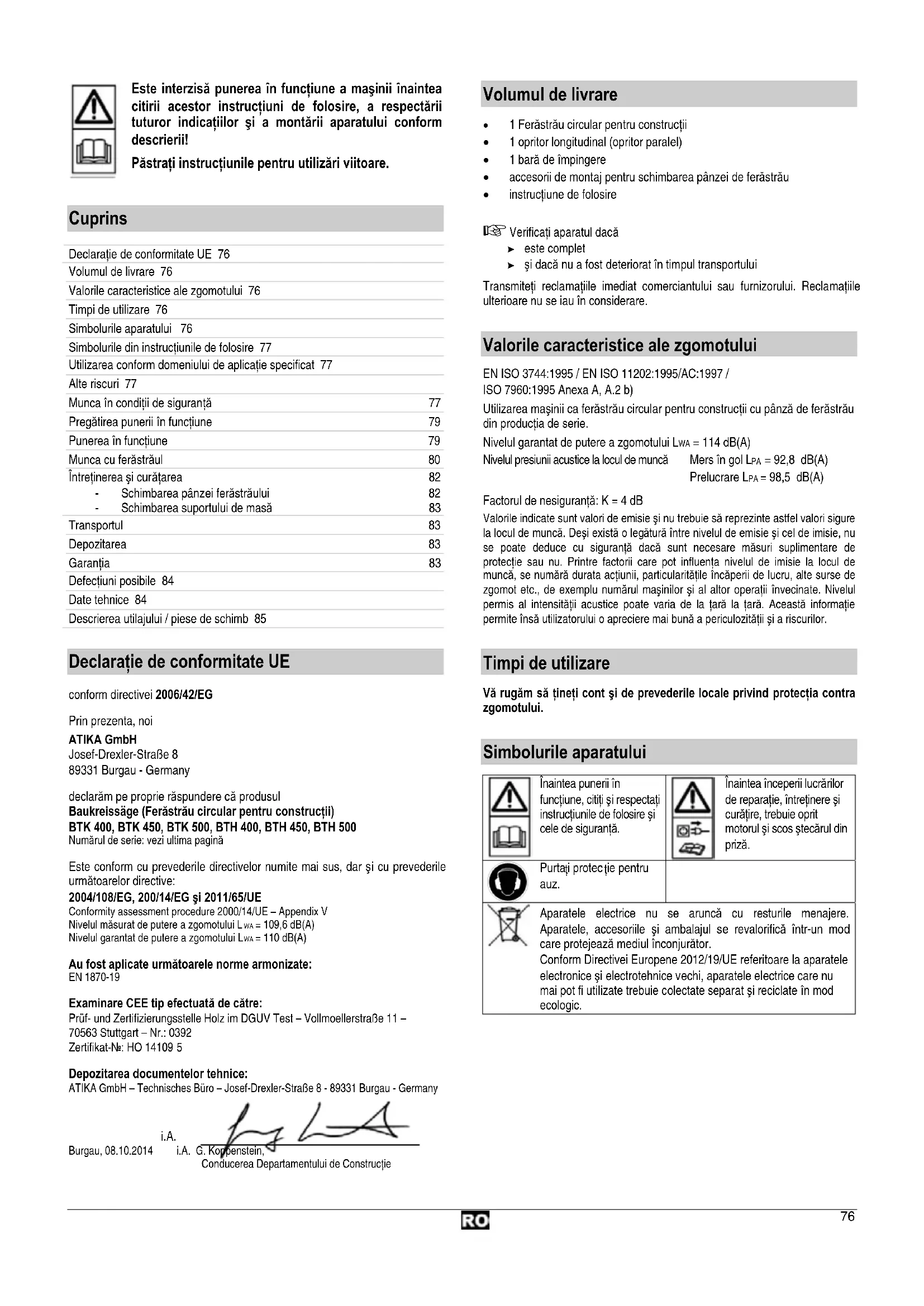 Utilizarea conform domeniului de aplicaţie specificat Ferăstrăul circular pentru construcţii este prevăzut exclusiv pentru tăieri longitudinale şi transversale de lemn masiv şi materiale pentru plăci de lemn, cum ar fi PAL, panele, plăci din MDF cu secţiune transversală pătrată sau dreptunghiulară, în afara spaţiilor închise, folosind pânze de ferăstrău circular HM, conform EN 847-1. Grosimea lemnului nu trebuie să depăşească următoarele valori: BTK/BTH 400: 126 mm BTK/BTH 450: 150 mm BTK/BTH 500: 175 mm Diametrul pânzei de ferăstrău trebuie să se încadreze între următoarele valori: BTK/BTH 400: 395 – 400 mm BTK/BTH 450: 445 – 450 mm BTK/BTH 500: 495 – 500 mm Tăieturile transversale trebuie să fie efectuate numai cu opritorul transversal montat. Este permisă doar prelucrarea pieselor care se pot poziţiona în siguranţă. Utilizarea de pânze de ferăstrău din oţel HSS (oţel rapid înalt aliat) nu este permis ă, deoarece acest oţel este dur şi casabil. Pericol de rănire prin ruperea pânzei de ferăstrău şi răspândirea de fragmente de pânză de ferăstrău. Prin folosirea conformă destinaţiei se înţelege şi respectarea condiţiilor de montaj, folosire, întreţinere şi reparaţie impuse de producător, dar şi respectarea măsurilor de siguranţă prevăzute în aceste instrucţiuni. Trebuie respectate măsurile de prevenire a accidentelor valabile pentru utilizare, cât şi alte reguli general valabile în medicina muncii şi în ale tehnicii de siguranţă. Orice alt mod de utilizare este considerat neconform cu domeniul de aplicaţie specificat. Producătorul nu răspunde de daunele de orice natură provocate, astfel: riscul îi revine în întregime utilizatorului. Producătorul nu răspunde de daunele provocate de modificările arbitrare aduse ferăstrăului. Montarea, folosirea şi întreţinerea ferăstrăului este permisă numai persoanelor, care sunt instruite şi cunosc pericolele. Lucrările de reparaţii pot fi efectuate numai de noi, resp. de firme de prestare a serviciilor numite de noi. Acest aparat nu trebuie să fie utilizat în medii cu pericol de explozie. Bucăţile de metal (cuie, etc.) trebuie neapărat îndepărtate din materialul ce urmează să fie tăiat.