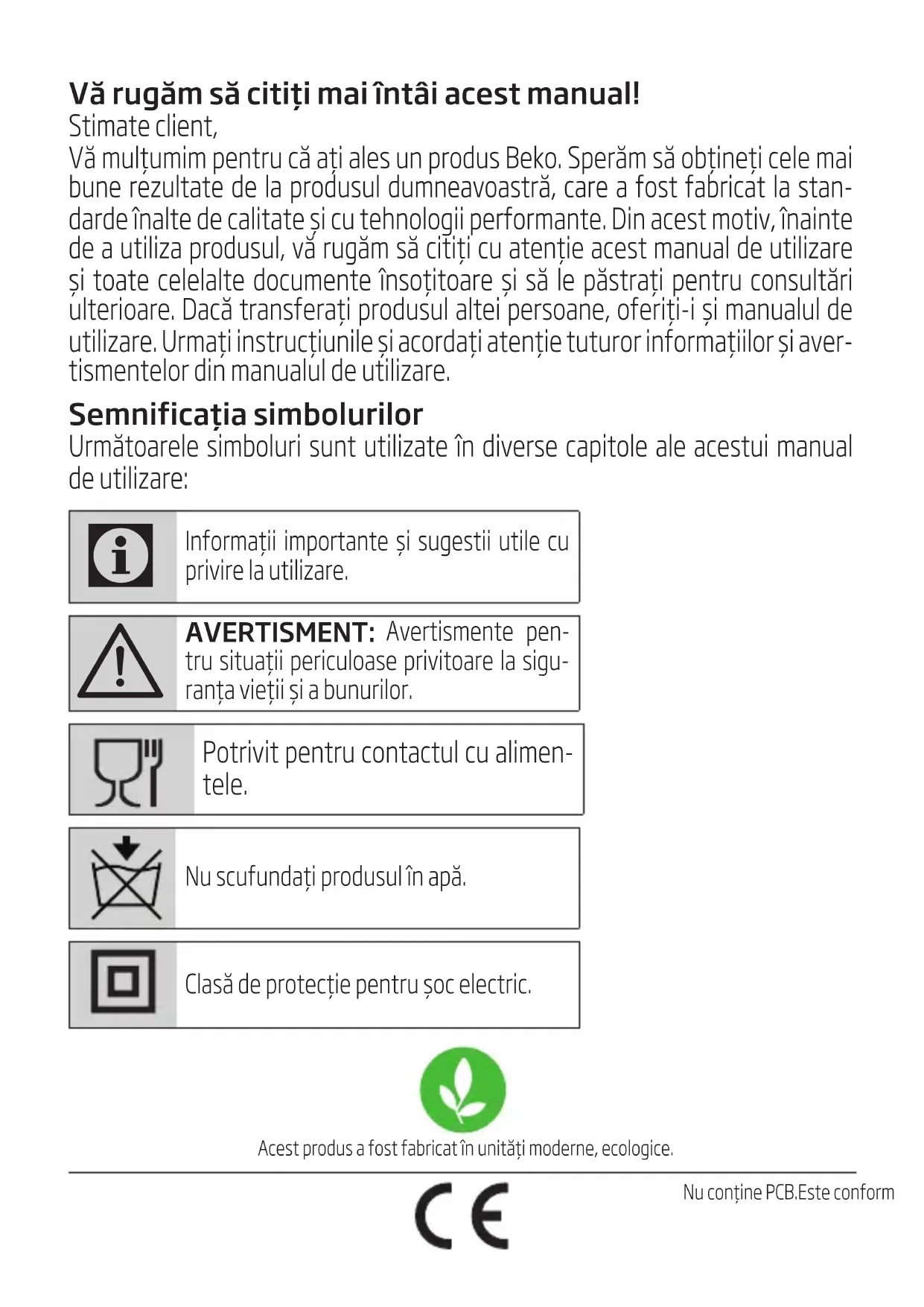 Prima di contattare l’assistenza tecnica, al fine di agevolare la gestione della chiamata, è necessario avere a portata di mano il modello del prodotto e il documento fiscale di acquisto.Vă rugăm să citiți mai întâi acest manual! Stimate client, Vă mulțumim pentru că ați ales un produs Beko. Sperăm să obțineți cele mai bune rezultate de la produsul dumneavoastră, care a fost fabricat la stan- darde înalte de calitate și cu tehnologii performante. Din acest motiv, înainte de a utiliza produsul, vă rugăm să citiți cu atenție acest manual de utilizare și toate celelalte documente însoțitoare și să le păstrați pentru consultări ulterioare. Dacă transferați produsul altei persoane, oferiți-i și manualul de utilizare. Urmați instrucțiunile și acordați atenție tuturor informațiilor și aver- tismentelor din manualul de utilizare. Semnificația simbolurilor Următoarele simboluri sunt utilizate în diverse capitole ale acestui manual de utilizare: