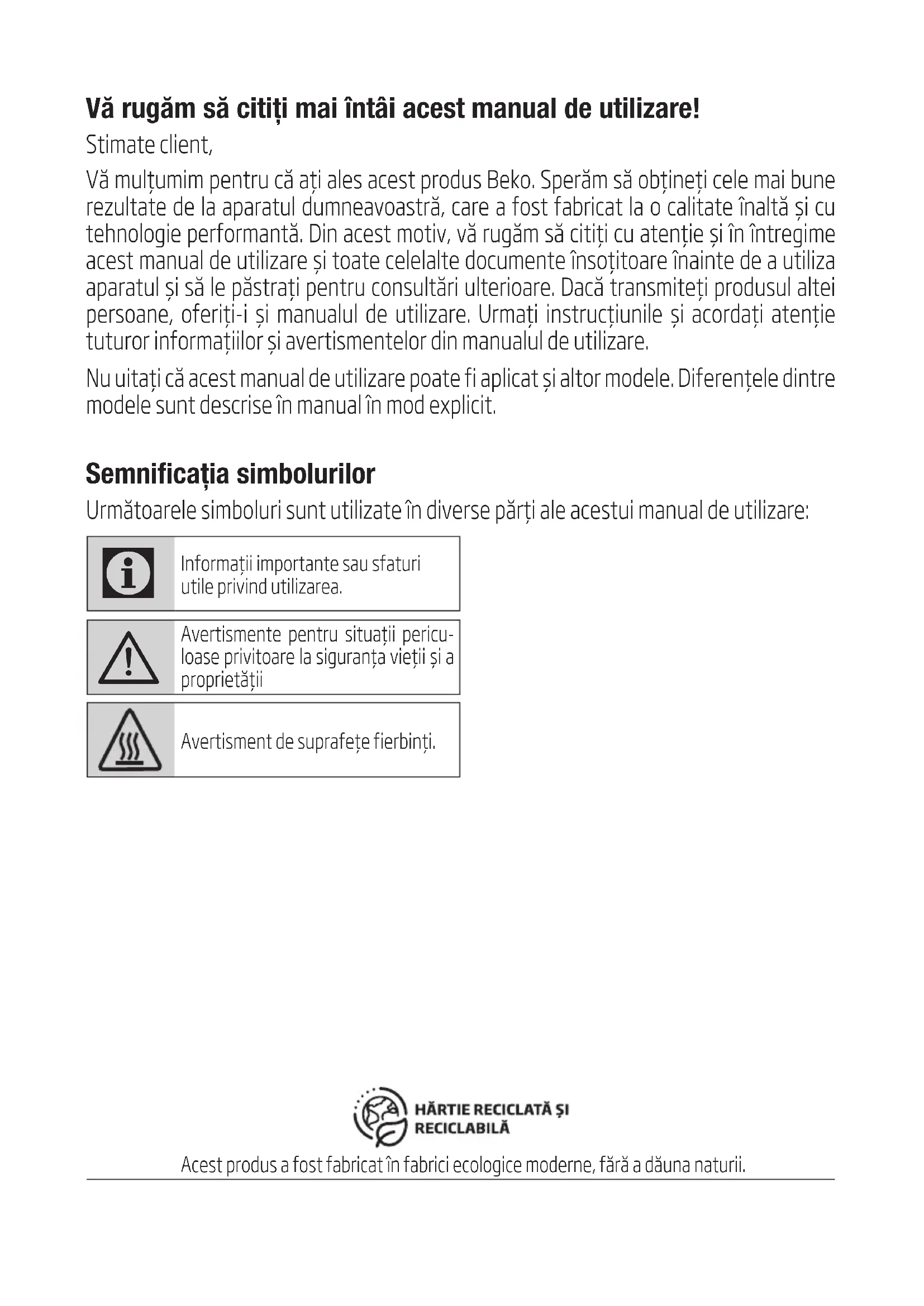 - Транспортирайте продукта в нормално по- ложение. Не го оставяйте облегнат върху страничните или задната му страна.Vă rugăm să citiți mai întâi acest manual de utilizare! Stimate client, Vă mulțumim pentru că ați ales acest produs Beko. Sperăm să obțineți cele mai bune rezultate de la aparatul dumneavoastră, care a fost fabricat la o calitate înaltă și cu tehnologie performantă. Din acest motiv, vă rugăm să citiți cu atenție și în întregime acest manual de utilizare și toate celelalte documente însoțitoare înainte de a utiliza aparatul și să le păstrați pentru consultări ulterioare. Dacă transmiteți produsul altei persoane, oferiți-i și manualul de utilizare. Urmați instrucțiunile și acordați atenție tuturor informațiilor și avertismentelor din manualul de utilizare. Nu uitați că acest manual de utilizare poate fi aplicat și altor modele. Diferențele dintre modele sunt descrise în manual în mod explicit. Semnificația simbolurilor Următoarele simboluri sunt utilizate în diverse părți ale acestui manual de utilizare: