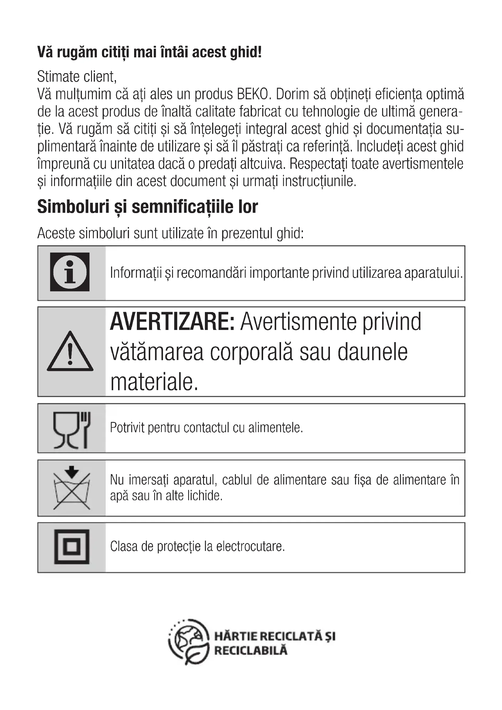 - Ако апаратот падне, можеби нема да работи или ќе има трајни оштетувања.Vă rugăm citiți mai întâi acest ghid! Stimate client, Vă mulțumim că ați ales un produs BEKO. Dorim să obțineți eficiența optimă de la acest produs de înaltă calitate fabricat cu tehnologie de ultimă genera- ție. Vă rugăm să citiți și să înțelegeți integral acest ghid și documentația su- plimentară înainte de utilizare și să îl păstrați ca referință. Includeți acest ghid împreună cu unitatea dacă o predați altcuiva. Respectați toate avertismentele și informațiile din acest document și urmați instrucțiunile. Simboluri și semnificațiile lor Aceste simboluri sunt utilizate în prezentul ghid: