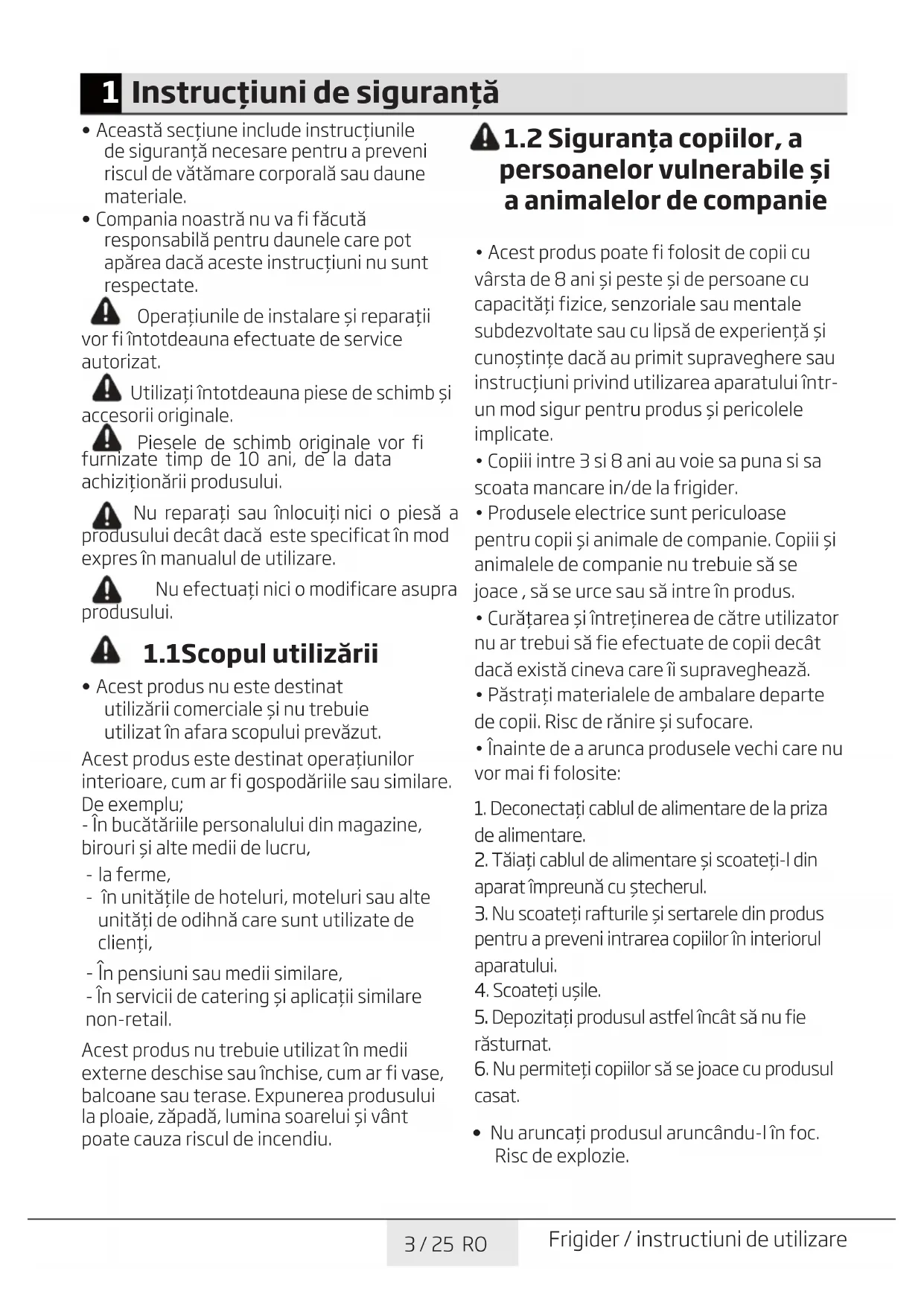 - Nu aşezaţi şi nu utilizaţi aparate electrice în interiorul frigiderelor/congelatorului decât dacă acest lucru este recomandat de către producător.6 / 25 RO Instrucţiuni de siguranţă