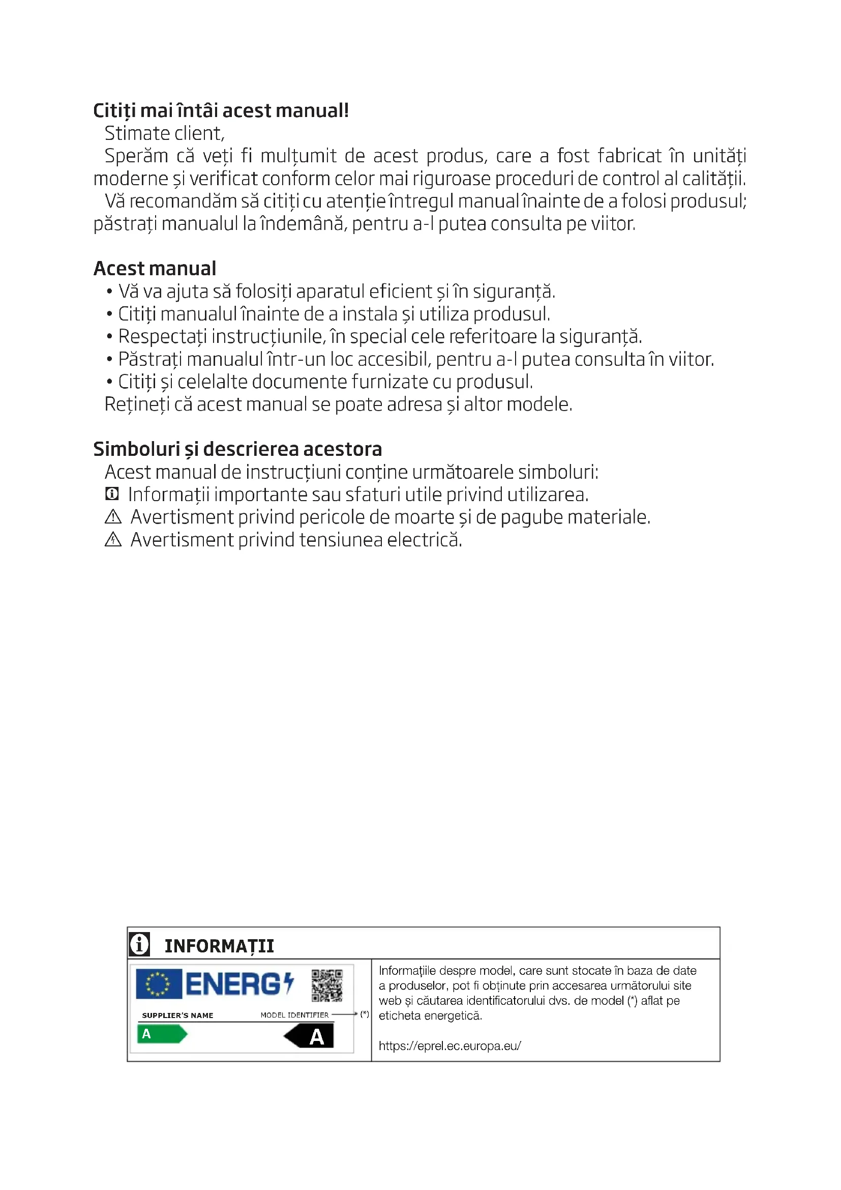 Informațiile despre model, care sunt stocate în baza de date a produselor, pot fi obținute prin accesarea următorului site web și căutarea identificatorului dvs. de model (*) aflat pe eticheta energetică.https://eprel.ec.europa.eu/