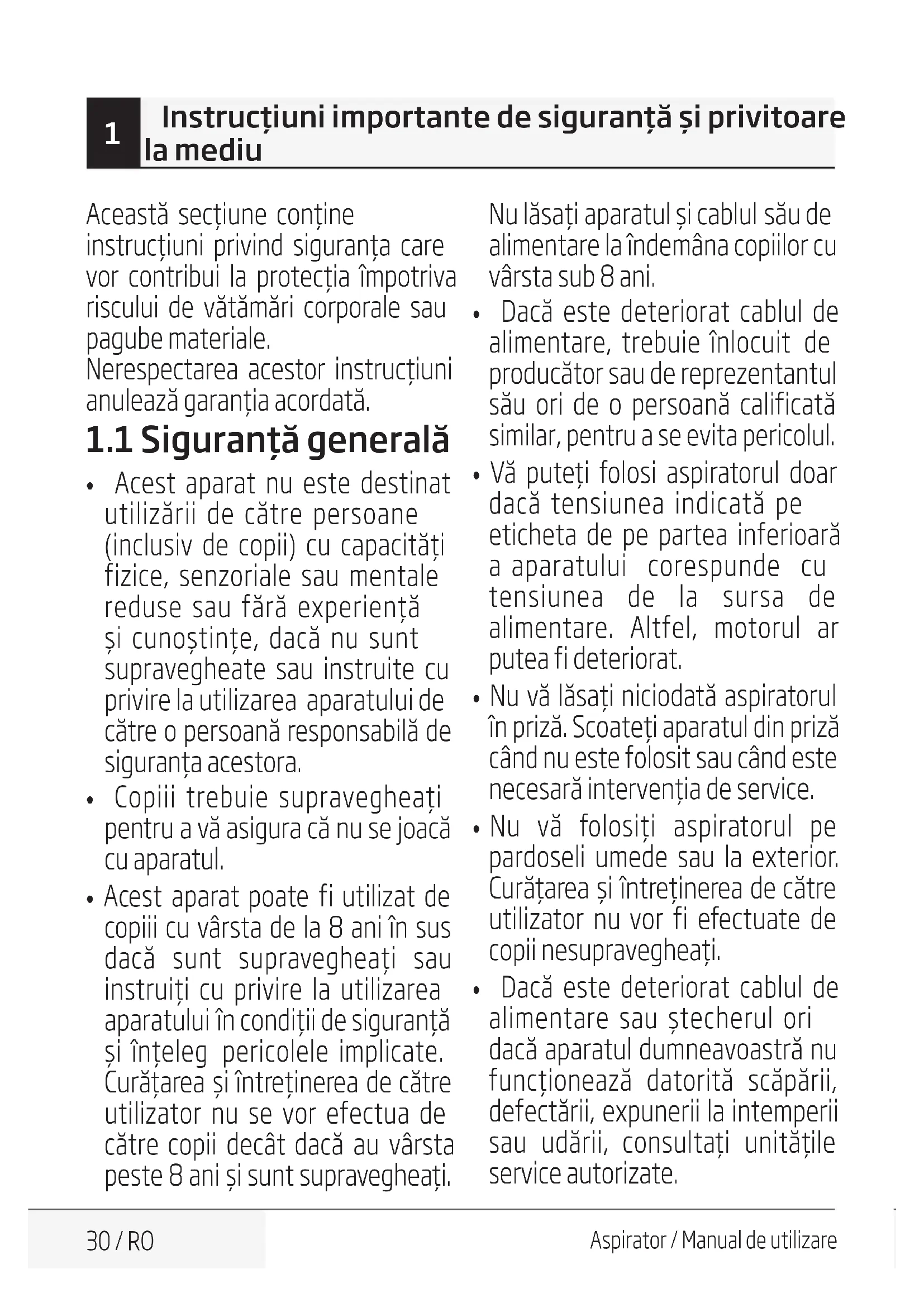 - Dacă este deteriorat cablul de alimentare sau ștecherul ori dacă aparatul dumneavoastră nu funcționează datorită scăpării, defectării, expunerii la intemperii sau udării, consultați unitățile service autorizate.Aspirator / Manual de utilizare 31 / RO
