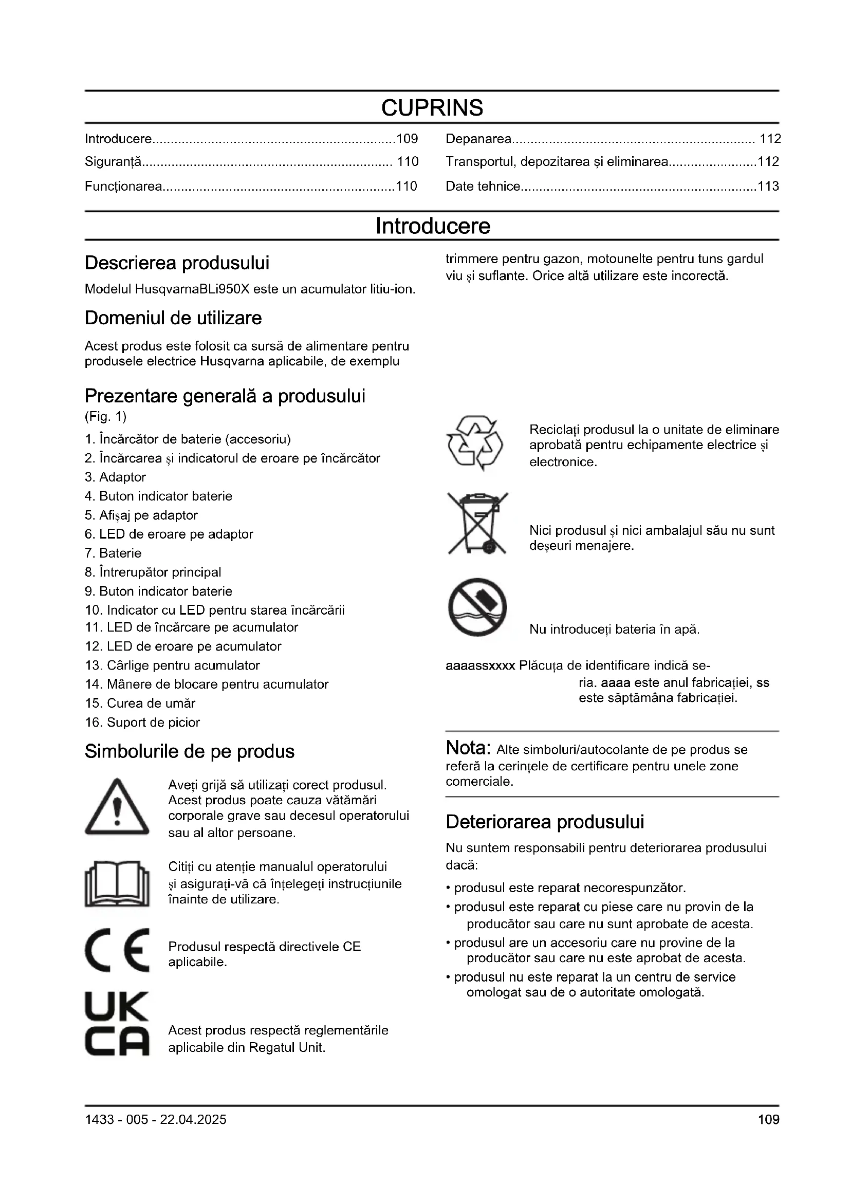 Simbolurile de pe produs Aveți grijă să utilizați corect produsul. Acest produs poate cauza vătămări corporale grave sau decesul operatorului sau al altor persoane. Citiți cu atenție manualul operatorului și asigurați-vă că înțelegeți instrucțiunile înainte de utilizare. Produsul respectă directivele CE aplicabile. Acest produs respectă reglementările aplicabile din Regatul Unit. Reciclați produsul la o unitate de eliminare aprobată pentru echipamente electrice și electronice. Nici produsul și nici ambalajul său nu sunt deșeuri menajere. Nu introduceți bateria în apă. aaaassxxxx Plăcuța de identificare indică se- ria. aaaa este anul fabricației, ss este săptămâna fabricației. Nota: Alte simboluri/autocolante de pe produs se referă la cerințele de certificare pentru unele zone comerciale. Deteriorarea produsului Nu suntem responsabili pentru deteriorarea produsului dacă: