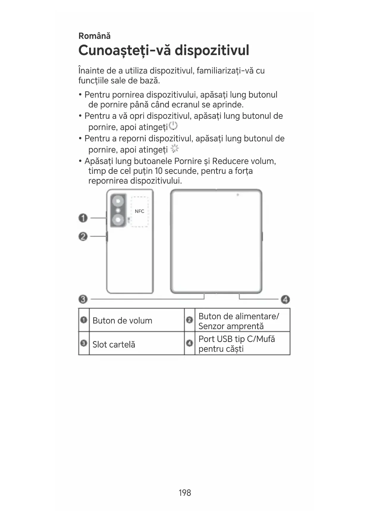 Buton de volum Buton de alimentare/ Senzor amprentă Slot caelă Po USB tip C/Mufă pentru căști 198• Când utilizați funcția NFC, poziționați zona NFC lângă celelalte dispozitive sau obiecte.