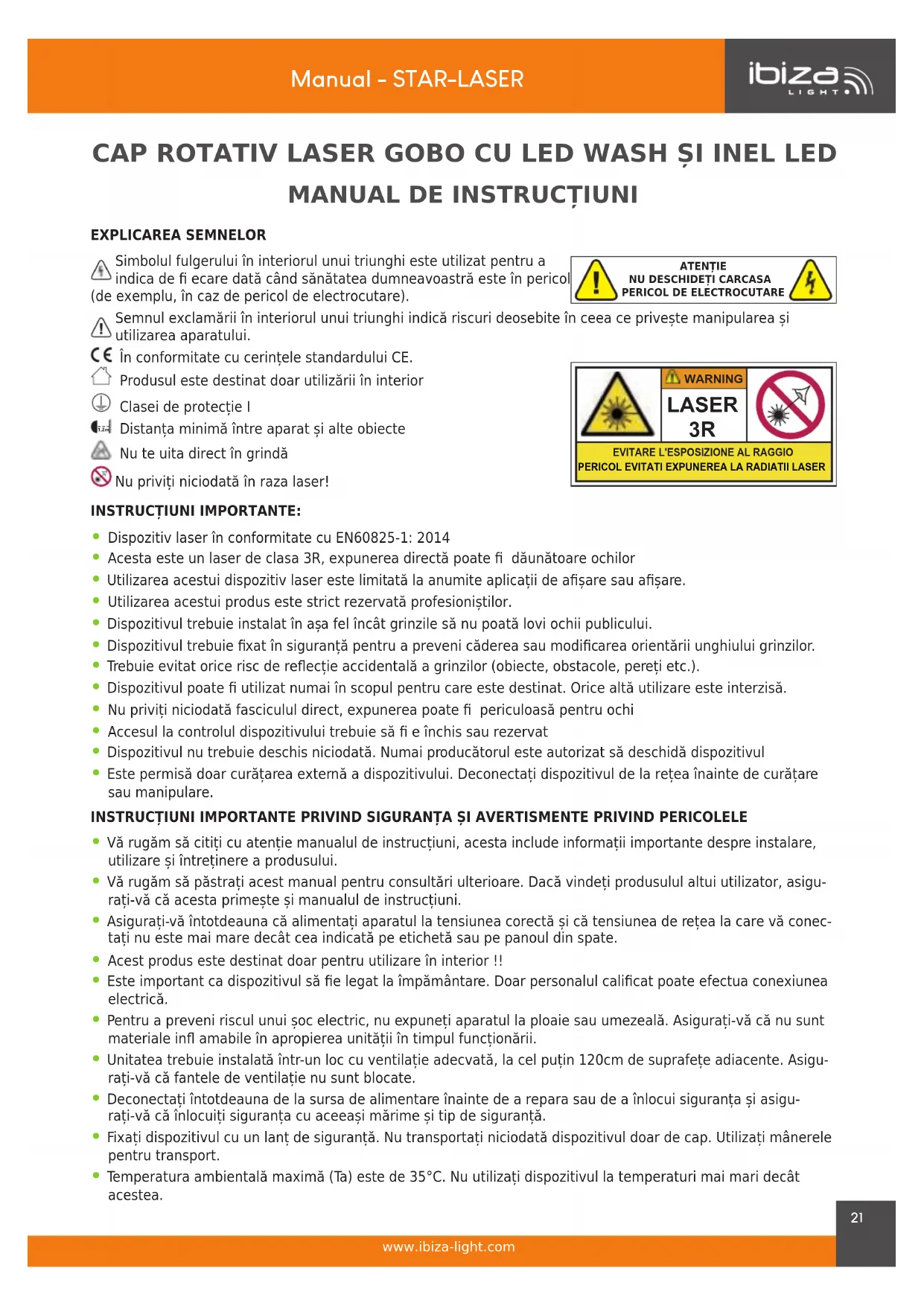EXPLICAREA SEMNELORSimbolul fulgerului în interiorul unui triunghi este utilizat pentru a indica de ecare dată când sănătatea dumneavoastră este în pericol (de exemplu, în caz de pericol de electrocutare).Semnul exclamării în interiorul unui triunghi indică riscuri deosebite în ceea ce privește manipularea și utilizarea aparatului.În conformitate cu cerințele standardului CE.Produsul este destinat doar utilizării în interiorClasei de protecție I 1.2m Distanța minimă între aparat și alte obiecteNu te uita direct în grindă Nu priviți niciodată în raza laser! INSTRUCȚIUNI IMPORTANTE:
