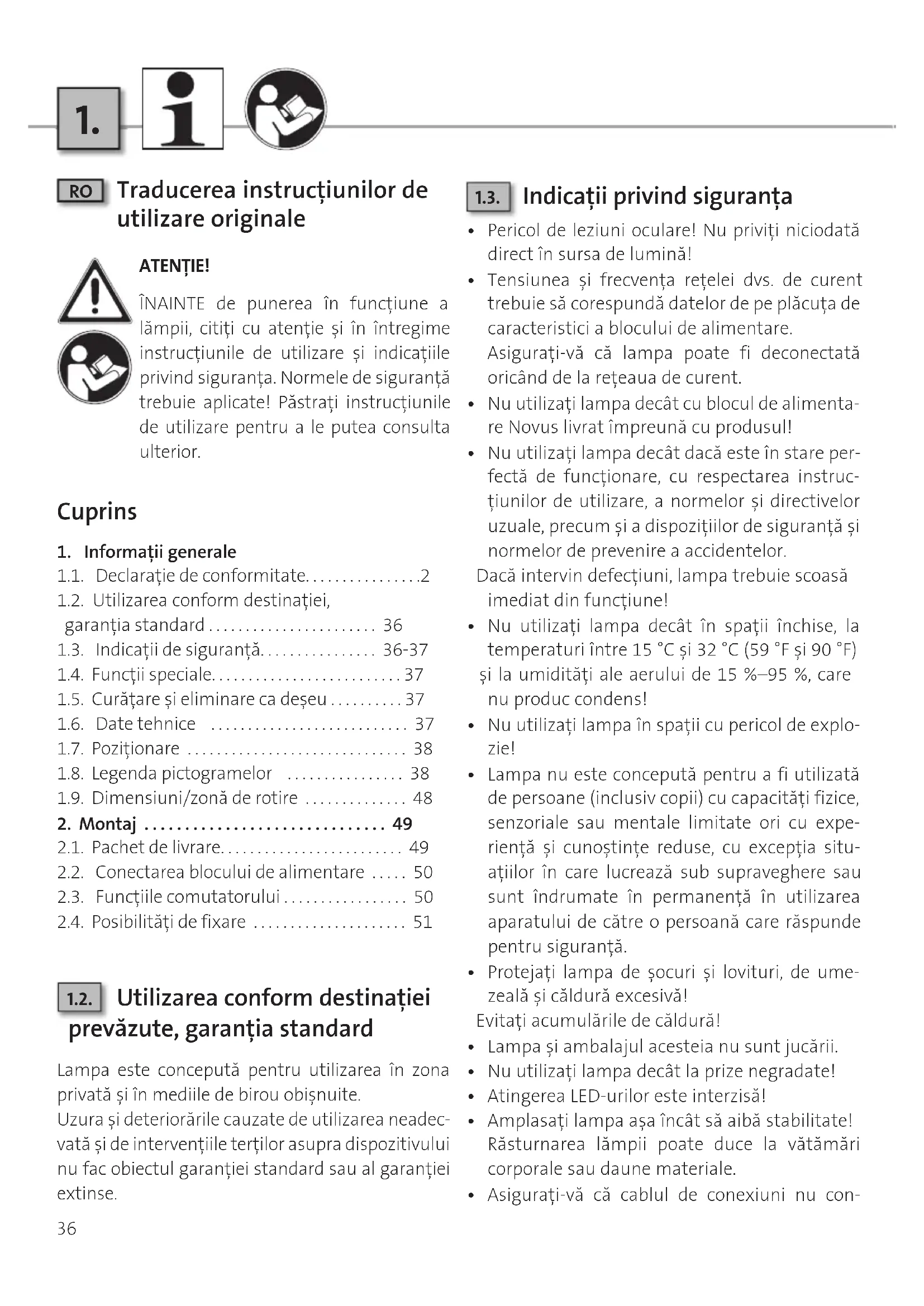 Traducerea instrucţiunilor de utilizare originale ATENŢIE! ÎNAINTE de punerea în funciune a lămpii, citii cu atenie şi în întregime instruciunile de utilizare şi indicaiile privind sigurana. Normele de sigurană trebuie aplicate! Păstrai instruciunile de utilizare pentru a le putea consulta ulterior. Cuprins