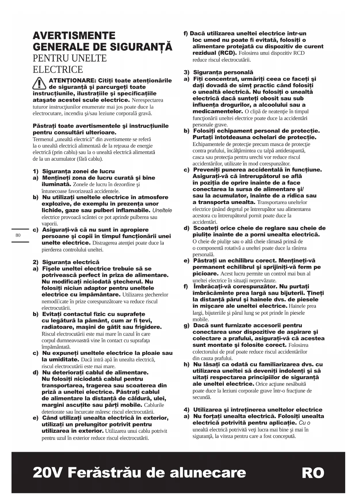 PENTRU UNELTE ELECTRICE ATENŢIONARE: Citiţi toate atenţionările de siguranţă şi parcurgeţi toate instrucţiunile, ilustraţiile şi specicaţiile ataşate acestei scule electrice. Nerespectarea tuturor instrucţiunilor enumerate mai jos poate duce la electrocutare, incendiu şi/sau leziune corporală gravă. Păstraţi toate avertismentele şi instrucţiunile pentru consultări ulterioare. Termenul „unealtă electrică” din avertismente se referă la o unealtă electrică alimentată de la reţeaua de energie electrică (prin cablu) sau la o unealtă electrică alimentată de la un acumulator (fără cablu).