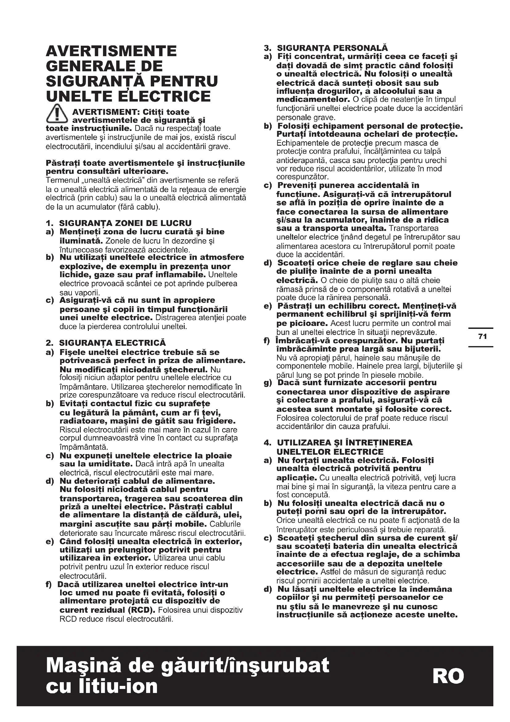 UNELTELOR ELECTRICE a) Nu forţaţi unealta electrică. Folosiţi unealta electrică potrivită pentru aplicaţie. Cu unealta electrică potrivită, veţi lucra mai bine şi mai în siguranţă, la viteza pentru care a fost concepută. b) Nu folosiţi unealta electrică dacă nu o puteţi porni sau opri de la întrerupător. Orice unealtă electrică ce nu poate acţionată de la întrerupător este periculoasă şi trebuie reparată. c) Scoateţi ştecherul din sursa de curent şi/ sau scoateţi bateria din unealta electrică înainte de a efectua reglaje, de a schimba accesoriile sau de a depozita uneltele electrice. Astfel de măsuri de siguranţă reduc riscul pornirii accidentale a uneltei electrice. d) Nu lăsaţi uneltele electrice la îndemâna copiilor şi nu permiteţi persoanelor ce nu ştiu să le manevreze şi nu cunosc instrucţiunile să acţioneze aceste unelte.72 Maşină de găurit/înşurubat cu litiu-ion