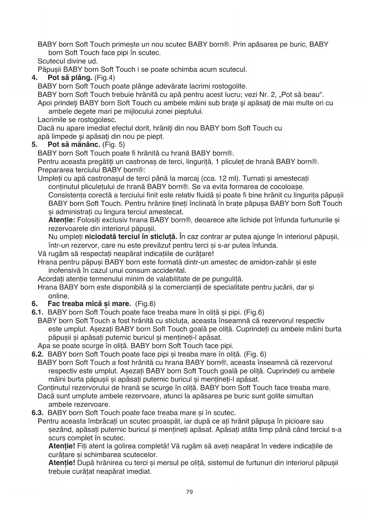 BABYbornSoftTouchafosthrănităcusticluța,aceastaînseamnăcărezervorulrespectiv esteumplut.AșezațiBABYbornSoftTouchgoalăpeoliță.Cuprindețicuambelemâiniburta păpușiișiapăsațiputernicburiculșimențineți-lapăsat. Apasepoatescurgeînoliță.BABYbornSoftTouchfacepipi. 6.2. BABYbornSoftTouchpoatefacepipișitreabamareînoliță.(Fig.6) BABYbornSoftTouchafosthrănităcuhranaBABYborn®,aceastaînseamnăcărezervorul respectivesteumplut.AșezațiBABYbornSoftTouchgoalăpeoliță.Cuprindețicuambele mâiniburtapăpușiișiapăsațiputernicburiculșimențineți-lapăsat. Conținutulrezervoruluidehranăsescurgeînoliță.BABYbornSoftTouchfacetreabamare. Dacăsuntumpluteambelerezervoare,atuncilaapăsareapeburicsuntgolitesimultan ambelerezervoare. 6.3. BABYbornSoftTouchpoatefacetreabamareșiînscutec. Pentruaceastaîmbrăcațiunscutecproaspăt,iardupăceațihrănitpăpușaînpicioaresau șezând,apăsațiputernicburiculșimenținețiapăsat.Apăsațiatâtatimppânăcândterciuls-a scurscompletînscutec. Atenție! Fițiatentlagolireacompletă!Vărugămsăavețineapăratînvedereindicațiilede curățareșischimbareascutecelor. Atenție! Dupăhrănireacutercișimersulpeoliță,sistemuldefurtunuridininteriorulpăpușii trebuiecurățatneapăratimediat.80