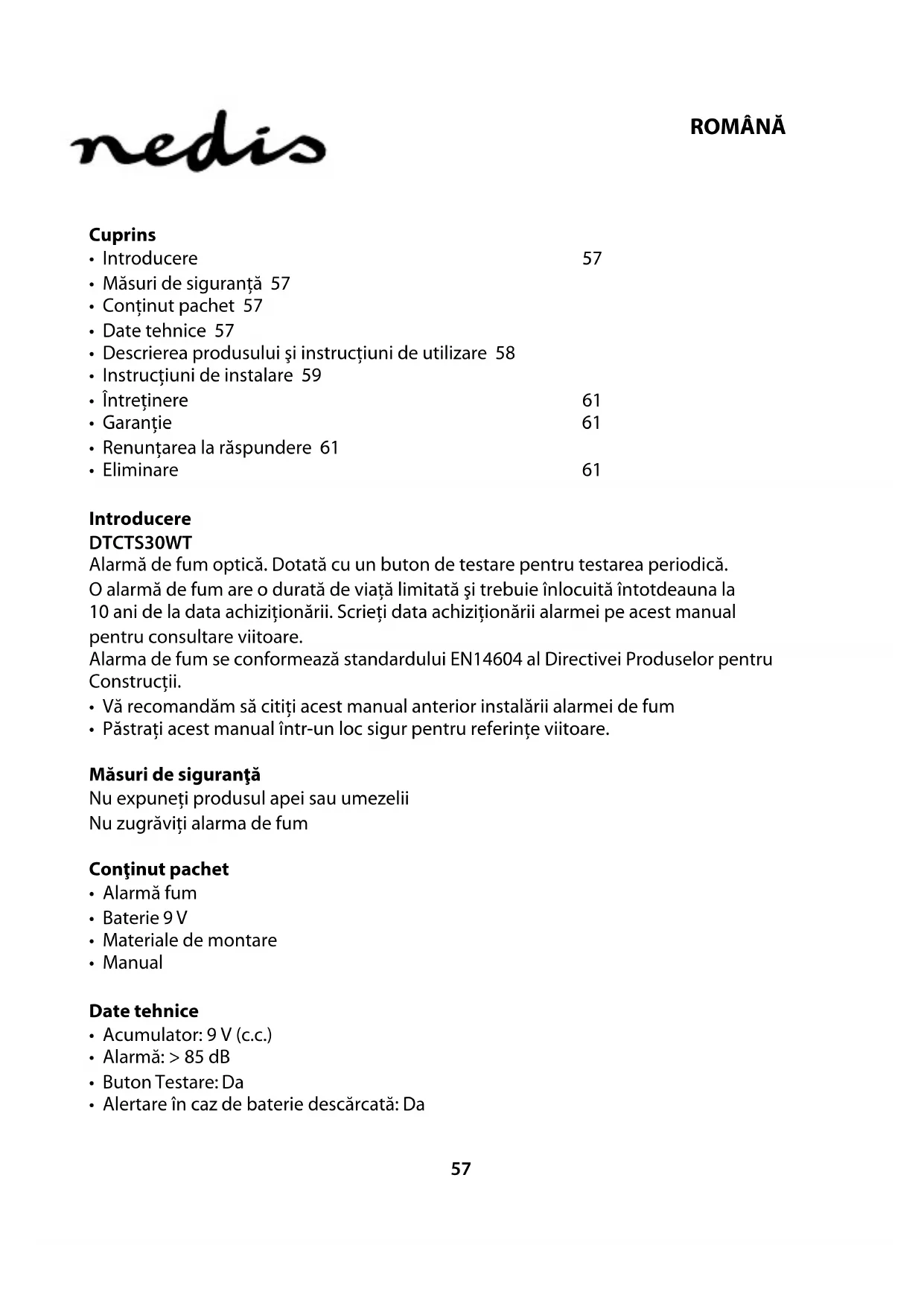 Descărcați instrucțiunile pentru Detector de fum în format PDF gratuit! Găsiți manualul dvs. DTCT30WT - NEDIS și luați din nou în mână dispozitivul dvs. electronic. Pe această pagină sunt publicate toate documentele necesare pentru utilizarea dispozitivului dvs. DTCT30WT mărcii NEDIS.