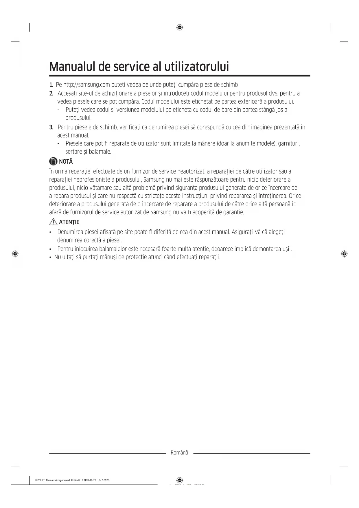 - Nu uitaţi să purtaţi mănuşi de protecţie atunci când efectuaţi reparaţii. RB7300T_User-servicing-manual_RO.indd 1 2020-11-19 PM 5:57:55Română Imaginea efectivă şi piesele furnizate ale frigiderului pot diferi, în funcţie de model şi de ţară.