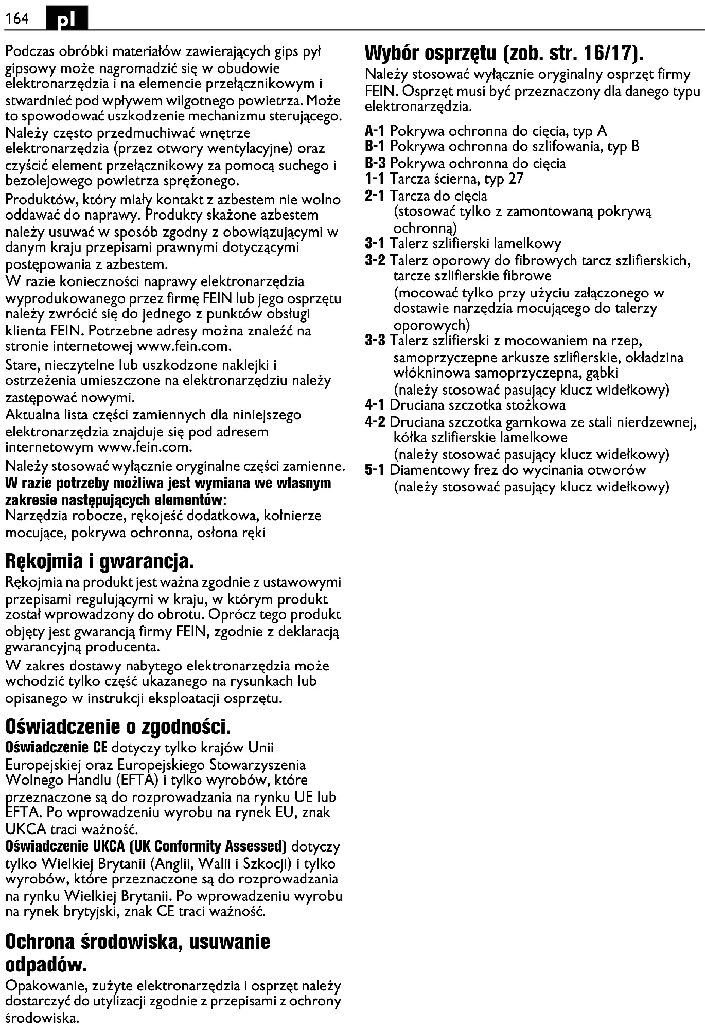 Respectați indicațiile de siguranță și instrucțiunile livrate împreună cu protecția împotriva căderii. Verificați echipamentul de asigurare împotriva căderii înainte de fiecare utilizare cu privire la deteriorări, precum țesătură tăiată, ruptă sau franjurată și cusături deteriorate. Nu este permisă utilizarea echipamentelor de asigurare împotriva căderii deteriorate, ele trebuie înlocuite imediat. Înainte de fiecare utilizare, verificați punctul de fixare la scula electrică cu privire la fixarea fermă și deteriorări precum rupturi și muchii ascuțite. Punctele de fixare desfăcute sau deteriorate nu trebuie utilizate pentru fixarea echipamentelor de asigurare împotriva căderii. Nu utilizați echipamentul de asigurare împotriva căderii pentru a vă asigura personal și nu îl fixați de dumneavoastră. Nu încercați să prindeți o sculă electrică aflată în cădere. Nu utilizați echipamentul de asigurare împotriva căderii în apropierea componentelor aflate în mișcare. Echipamentul de asigurare împotriva căderii se poate agăța și provoca pericole mari. Înainte de utilizarea echipamentului de asigurare împotriva căderii, verificați fixarea fermă a componentelor detașabile de la scula electrică. Asigurați-vă că utilizarea unui echipament de asigurare împotriva căderii nu influențează utilizarea sculei electrice și a dispozitivelor de protecție ale acesteia. Legați protecția împotriva căderii numai în modul prezentat aici de punctul de fixare al sculei electrice (consultați pagina 6). Întreţinere şi asistenţă service post- vânzări. Vă rugăm să aveți în vedere că, în pincipiu, sculele electrice pot fi reparate, întreținute și verificate numai de electricieni specializați, deoarece reparațiile necorespuzătoare pot cauza pericole considerabile pentru utilizator. În condiții de lucru extreme, la prelucrarea metalelor, în interiorul sculei electrice se poate depune praf bun conducător electric. Izolația de protecție a sculei electrice poate fi afectată. Suflați frecvent prin fantele de aerisire aer comprimat uscat și fără ulei în interiorul sculei electrice. În cazul prelucrării materialelor care conțin ipsos, în interiorul sculei electrice și pe elementul de comutare se poate depune praf, care, datorită umidității aerului, se poate întări. Aceasta poate cauza deteriorări ale mecanismului de comutare. Curățați frecvent interiorul sculei electrice, suflând aer comprimat uscat, fără ulei, prin orificiile de aerisire și elementul de comutare. Produsele care au intrat în contact cu azbestul, nu trebuie date la reparat. Eliminați produsele contaminate cu azbest conform reglementărileor în vigoare în țara dumneavoastră privind eliminarea deșeurilor care conțin azbest. Pentru repararea sculelor electrice și accesoriilor FEIN care s-au defectat, adresați-vă atelierului dumneavoastră de asistență clienți FEIN. Adresa o găsiți pe internet la www.fein.com. Înlocuiţi etichetele şi avertismentele de pe scula electrică, în cazul în care acestea s-au învechit şi s-au uzat. Găsiţi lista actuală de piese de schimb pentru această sculă electrică pe internet, la www.fein.com. Folosiţi numai piese de schimb originale. Puteţi schimba şi singuri, dacă este necesar, următoarele piese: Unelte, mâner suplimentar, flanșă de fixare, scut, protecție mâini Garanţia legală de conformitate şi garanţia comercială. Garanţia legală de conformitate a produsului se acordă conform reglementărilor legale din ţara punerii în circulaţie a acestuia. În plus, FEIN acordă o garanţie comercială conform certificatului de garanţie al producătorului FEIN. Setul de livrare al sculei dumneavoastră electrice poate să cuprindă numai o parte a accesoriilor descrise sau ilustrate în prezentele instrucţiuni de folosire. Declaraţie de conformitate. Declarația CE este valabilă pentru țările Uniunii Europene și EFTA (European Free Trade Association) și numai pentru produsele destinate pieței UE sau EFTA. După punerea în circulație a produsului pe piața UE, marcajul UKCA își pierde valabilitatea. Declarația UKCA este valabilă numai pentru piața britanică (Anglia, Țara Galilior și Scoția) și numai pentru produsele destinate pieței britanice. După punerea în circulație a produsului pe piața britanică, marcajul CE își pierde valabilitatea. Protecţia mediului înconjurător, eliminare. Ambalajele, sculele electrice şi accesoriile scoase din uz trebuie direcţionate către o staţie de reciclare ecologică.173