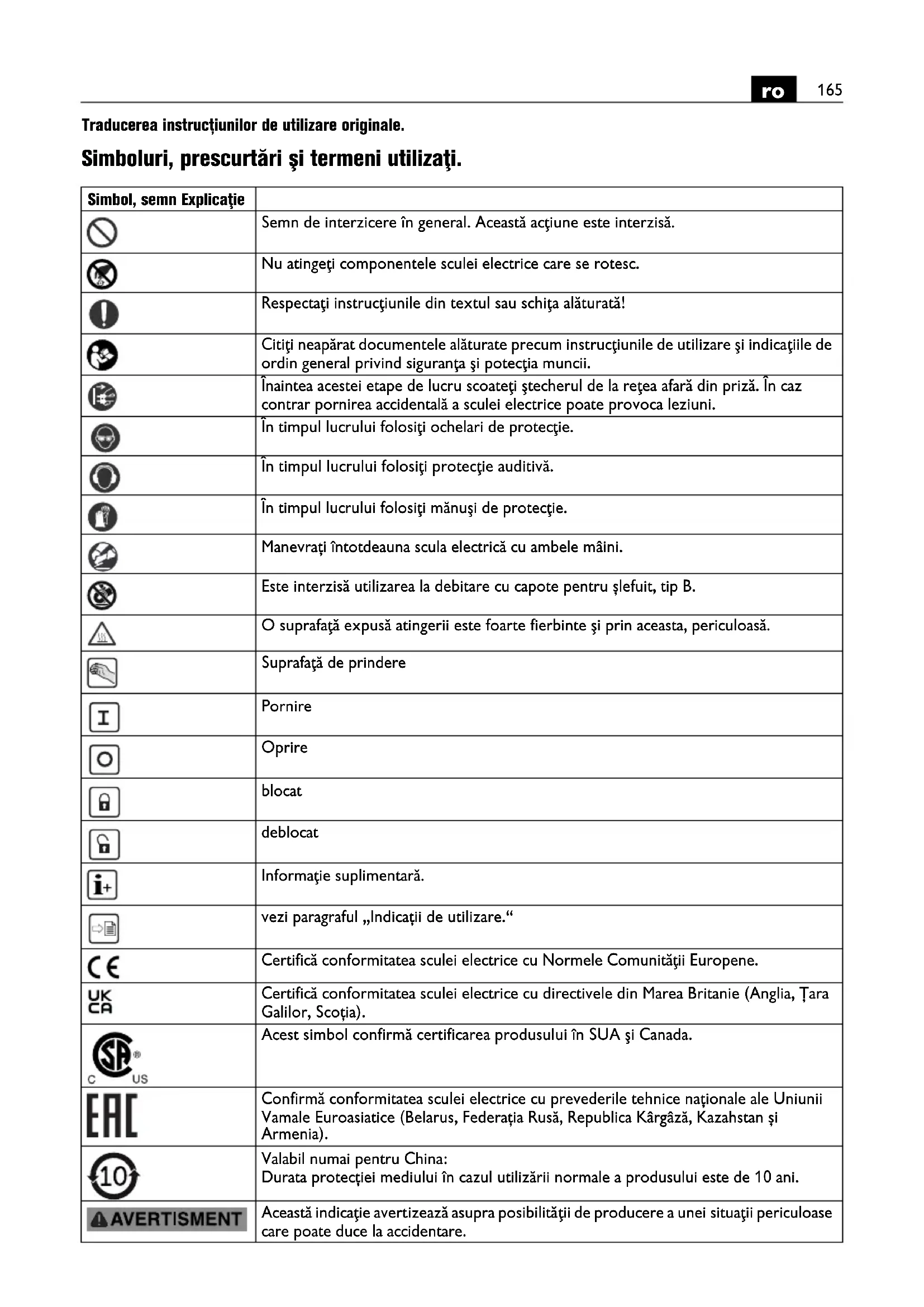 Traducerea instrucțiunilor de utilizare originale. Simboluri, prescurtări şi termeni utilizaţi. Simbol, semn Explicaţie Semn de interzicere în general. Această acţiune este interzisă. Nu atingeţi componentele sculei electrice care se rotesc. Respectaţi instrucţiunile din textul sau schiţa alăturată! Citiţi neapărat documentele alăturate precum instrucţiunile de utilizare şi indicaţiile de ordin general privind siguranţa şi potecţia muncii. Înaintea acestei etape de lucru scoateţi ştecherul de la reţea afară din priză. În caz contrar pornirea accidentală a sculei electrice poate provoca leziuni. În timpul lucrului folosiţi ochelari de protecţie. În timpul lucrului folosiţi protecţie auditivă. În timpul lucrului folosiţi mănuşi de protecţie. Manevrați întotdeauna scula electrică cu ambele mâini. Este interzisă utilizarea la debitare cu capote pentru șlefuit, tip B. O suprafaţă expusă atingerii este foarte fierbinte şi prin aceasta, periculoasă. Suprafaţă de prindere Pornire Oprire blocat deblocat Informaţie suplimentară. vezi paragraful „Indicații de utilizare.“ Certifică conformitatea sculei electrice cu Normele Comunităţii Europene. Certifică conformitatea sculei electrice cu directivele din Marea Britanie (Anglia, Țara Galilor, Scoția). Acest simbol confirmă certificarea produsului în SUA şi Canada. Confirmă conformitatea sculei electrice cu prevederile tehnice naționale ale Uniunii Vamale Euroasiatice (Belarus, Federația Rusă, Republica Kârgâză, Kazahstan și Armenia). Valabil numai pentru China: Durata protecției mediului în cazul utilizării normale a produsului este de 10 ani. Această indicaţie avertizează asupra posibilităţii de producere a unei situaţii periculoase care poate duce la accidentare.166