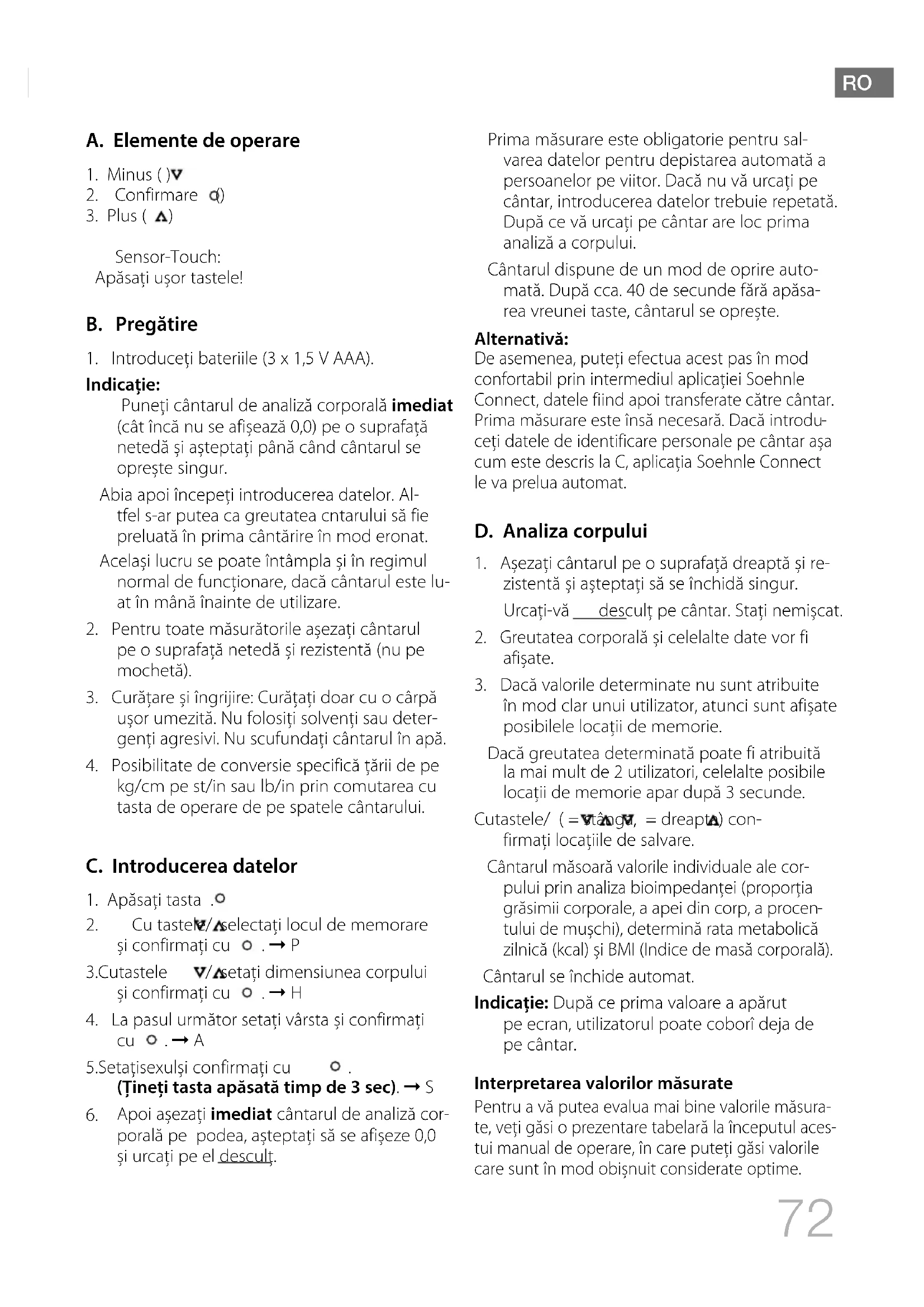 tului de mușchi), determină rata metabolică zilnică (kcal) și BMI (Indice de masă corporală). Cântarul se închide automat. Indicație: După ce prima valoare a apărut pe ecran, utilizatorul poate coborî deja de pe cântar. Interpretarea valorilor măsurate Pentru a vă putea evalua mai bine valorile măsura- te, veți găsi o prezentare tabelară la începutul aces- tui manual de operare, în care puteți găsi valorile care sunt în mod obișnuit considerate optime.73