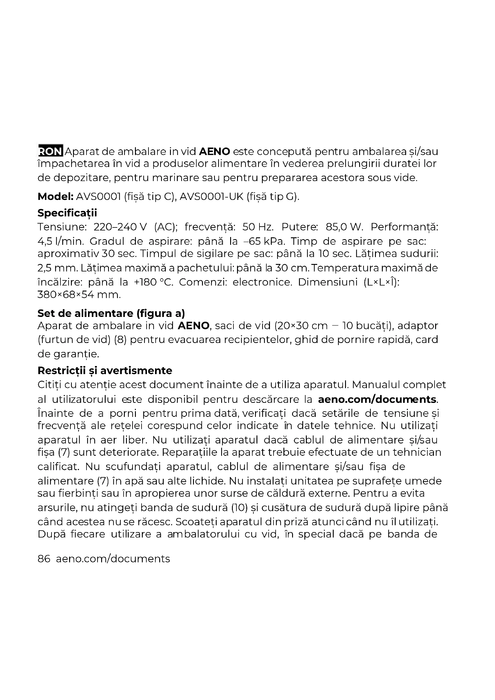 - Szew uszczelniający jest słaby. Możliwa przyczyna: niewystarczający czas zgrzewania. Rozwiązanie: powtórz proces zgrzewania ponownie, postępując zgodnie ze wszystkimi punktami instrukcji. OSTRZEŻENIE! Jeśli żadne z możliwych rozwiązań nie rozwiązuje problemu, należy skontaktować się z dostawcą lub centrum serwisowym. Proszę nie demontować ani nie próbować naprawiać urządzenia samodzielnie. Informacje dotyczące recyklingu Symbole te oznaczają, że podczas utylizacji urządzenia, jego baterii i akumulatorów oraz akcesoriów elektrycznych i elektronicznych należy przestrzegać przepisów dotyczących zużytego sprzętu elektrycznego i elektronicznego (WEEE) oraz baterii i akumulatorów. Zgodnie z przepisami to urządzenie podlega selektywnej utylizacji po zakończeniu okresu użytkowania. Nie wolno wyrzucać urządzenia, jego baterii i akumulatorów oraz akcesoriów elektrycznych i elektronicznych razem z niesortowanymi odpadami komunalnymi, ponieważ może to być szkodliwe dla środowiska. Aby utylizować urządzenie, należy je zwrócić do punktu sprzedaży lub przekazać do lokalnego centrum recyklingu. W celu uzyskania szczegółowych informacji należy skontaktować się z lokalnymi służbami zajmującymi się usuwaniem odpadów z gospodarstw domowych. Firma ASBISc zastrzega sobie prawo do modyfikowania urządzeńoraz wprowadzania zmian i modyfikacji w niniejszym dokumencie bez wcześniejszego informowania użytkowników. Okres gwarancji i użytkowania wynosi 2 lata od daty zakupu produktu. Dane producenta: ASBISc Enterprises PLC, Iapetou, 1, Agios Athanasios, 4101, Limassol, Cyprus (Cypr). Made in China. Aktualne informacje i szczegółowe opisy urządzeń, jak również instrukcje podłączenia, certyfikaty, reklamacje jakościowe i informacje gwarancyjne są dostępne do pobrania na stronie aeno.com/documents. Wszystkie wymienione znaki towarowe i nazwy marek są własnością ich właścicieli.86 aeno.com/documents RON Aparat de ambalare in vid AENO este concepută pentru ambalarea și/sau împachetarea în vid a produselor alimentare în vederea prelungirii duratei lor de depozitare, pentru marinare sau pentru prepararea acestora sous vide. Model: AVS0001 (fișă tip C), AVS0001-UK (fișă tip G). Specificații Tensiune: 220–240 V (AC); frecvență: 50 Hz. Putere: 85,0 W. Performanță: 4,5 l/min. Gradul de aspirare: până la –65 kPa. Timp de aspirare pe sac: aproximativ 30 sec. Timpul de sigilare pe sac: până la 10 sec. Lățimea sudurii: 2,5 mm. Lățimea maximă a pachetului: până la 30 cm. Temperatura maximă de încălzire: până la +180 °C. Comenzi: electronice. Dimensiuni (L×L×Î): 380×68×54 mm. Set de alimentare (figura a) Aparat de ambalare in vid AENO, saci de vid (20×30 cm ‒ 10 bucăți), adaptor (furtun de vid) (8) pentru evacuarea recipientelor, ghid de pornire rapidă, card de garanție. Restricții și avertismente Citiți cu atenție acest document înainte de a utiliza aparatul. Manualul complet al utilizatorului este disponibil pentru descărcare la aeno.com/documents. Înainte de a porni pentru prima dată, verificați dacă setările de tensiune și frecvență ale rețelei corespund celor indicate în datele tehnice. Nu utilizați aparatul în aer liber. Nu utilizați aparatul dacă cablul de alimentare și/sau fișa (7) sunt deteriorate. Reparațiile la aparat trebuie efectuate de un tehnician calificat. Nu scufundați aparatul, cablul de alimentare și/sau fișa de alimentare (7) în apă sau alte lichide. Nu instalați unitatea pe suprafețe umede sau fierbinți sau în apropierea unor surse de căldură externe. Pentru a evita arsurile, nu atingeți banda de sudură (10) și cusătura de sudură după lipire până când acestea nu se răcesc. Scoateți aparatul din priză atunci când nu îl utilizați. După fiecare utilizare a ambalatorului cu vid, în special dacă pe banda deaeno.com/documents 87 sudură (10) rămân reziduuri de plastic sau lichid sau dacă firimituri sau particule de alimente au pătruns în rezervorul de vid (11), este necesară curățarea. Scoateți aparatul din priză trăgând ștecherul de rețea (7) și lăsați-l să se răcească. Ștergeți-i suprafața cu o cârpă moale înmuiată în apă caldă sau într- o soluție de săpun blând. Apoi ștergeți cu o cârpă moale umezită cu apă curată și uscați. Nu utilizați detergenți puternici, paste abrazive, produse de lustruire sau detergenți care conțin acizi sau solvenți. Folosiți un ambalator în vid pentru a aspira și/sau sigila numai produse uscate. Aparatul nu este conceput pentru a manipula alimente umede sau lichide. Folosiți numai pungi și recipiente speciale pentru ambalatori în vid. Adaptorul (furtun de vid) (8) furnizat împreună cu ambalatorul cu vid este utilizat numai pentru a evacua aerul din recipientele speciale de vid. Înainte de a introduce în cuptorul cu microunde alimente ambalate într-o pungă sau într-un recipient, faceți o gaură în pungă sau deschideți supapa de ieșire (13) din recipient pentru a permite aburului să iasă. Utilizați numai accesorii, consumabile și/sau piese de schimb recomandate de producător. Informații detaliate pot fi găsite în manualul complet, disponibil pentru descărcare la aeno.com/documents. Nu lăsați aparatul pornit nesupravegheat. Lăsați aparatul să se răcească după utilizare. Aparatul poate fi utilizat numai de persoane cu mobilitate redusă, sub supraveghere și control direct. Atunci când aparatul nu este utilizat, pentru a preveni deformarea sigiliului (9) și afectarea performanțelor aparatului, se recomandă să se plaseze o inserție de hârtie în interiorul ambalatorului sub vid și să se închidă ușor capacul fără a bloca încuietorile capacului (12). Nu permiteți copiilor să folosească și/sau să se joace cu aparatul. Controlul dispozitivului Înainte de a porni ambalatorul cu vid pentru prima dată, asigurați