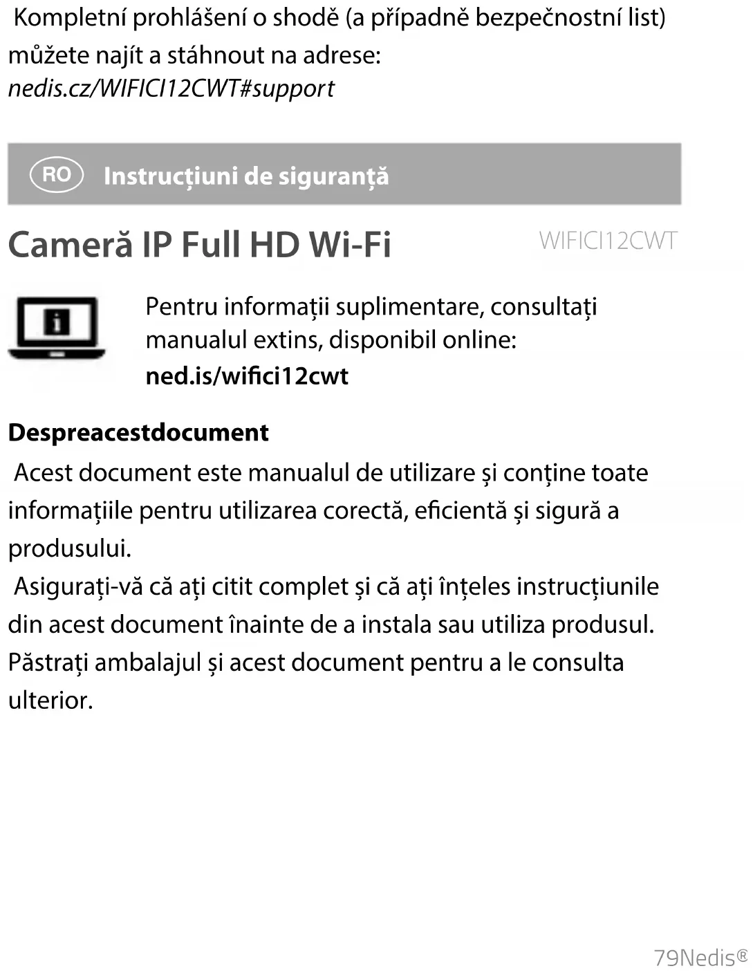 Instrucțiuni de siguranță Cameră IP Full HD Wi-Fi WIFICI12CWT Pentru informații suplimentare, consultați manualul extins, disponibil online: ned.is/wici12cwt Despre acest document Acest document este manualul de utilizare și conține toate informațiile pentru utilizarea corectă, ecientă și sigură a produsului. Asigurați-vă că ați citit complet și că ați înțeles instrucțiunile din acest document înainte de a instala sau utiliza produsul. Păstrați ambalajul și acest document pentru a le consulta ulterior.80 Simboluri utilizate