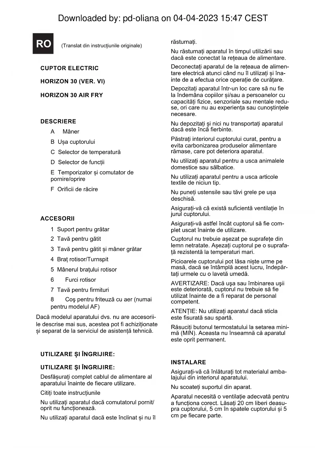 DESCRIERE A Mâner B Ușa cuptorului C Selector de temperatură D Selector de funcții E Temporizator și comutator de pornire/oprire F Oricii de răcire ACCESORII 1 Suport pentru grătar 2 Tavă pentru gătit 3 Tavă pentru gătit și mâner grătar 4 Braț rotisor/Turnspit 5 Mânerul brațului rotisor 6 Furci rotisor 7 Tavă pentru rmituri 8 Coş pentru friteuză cu aer (numai pentru modelul AF) Dacă modelul aparatului dvs. nu are accesorii- le descrise mai sus, acestea pot achiziționate și separat de la serviciul de asistență tehnică. UTILIZARE ȘI ÎNGRIJIRE: UTILIZARE ŞI ÎNGRIJIRE: Desfășurați complet cablul de alimentare al aparatului înainte de ecare utilizare. Citiți toate instrucțiunile Nu utilizați aparatul dacă comutatorul pornit/ oprit nu funcționează. Nu utilizați aparatul dacă este înclinat și nu îl Downloaded by: pd-oliana on 04-04-2023 15:47 CESTINSTRUCŢIUNI DE UTILIZARE ÎNAINTE DE UTILIZARE: Asiguraţi-vă că aţi înlăturat toate ambalajele produsului. Înainte de prima utilizare, curățați componentele care vor intra în contact cu alimentele în maniera prezentată în secțiunea despre curățare. UTILIZARE: Conectați aparatul la rețeaua de alimentare. Selectați temperatura de coacere dorită folo- sind selectorul de temperatură. (C) Selectați funcția cu care doriți să lucrați folo- sind selectorul de funcții (D) SELECTOR DE FUNCȚII (D) ► Oprit. ► Gătire cu convecție. Selectați această funcție dacă doriți să gătiți în mod tradițional, menținând o temperatură constantă și o găti- re accelerată datorate aerului prin convecție. ► Grătar cu convecție. Selectaţi această funcţie dacă doriţi să gătiţi cu elementele de încălzire superioare și inferioare cu menţi- nerea unei temperaturi constante şi coacere accelerată datorită aerului de convecţie ► Gătire tradițională. Utilizați această funcție pentru a gătit elementele de încălzire superioare și inferioare. ► Grătar/grătar cu rotisor. Utilizați aceas- tă funcție pentru a gratina alimentele într-un mod tradițional sau utilizați accesoriile pentru rotisor pentru a utiliza căldura din partea superioară cu ajutorul rotisorului. ► Rotisor (frigere) cu convecție. Selec- tați această funcție pentru a frige alimentele folosind accesoriul rotisor și pentru a le găti cu ajutorul convecției. De asemenea, folosiţi această funcţie pentru frigerea alimentelor cu coşul AIR FRY.