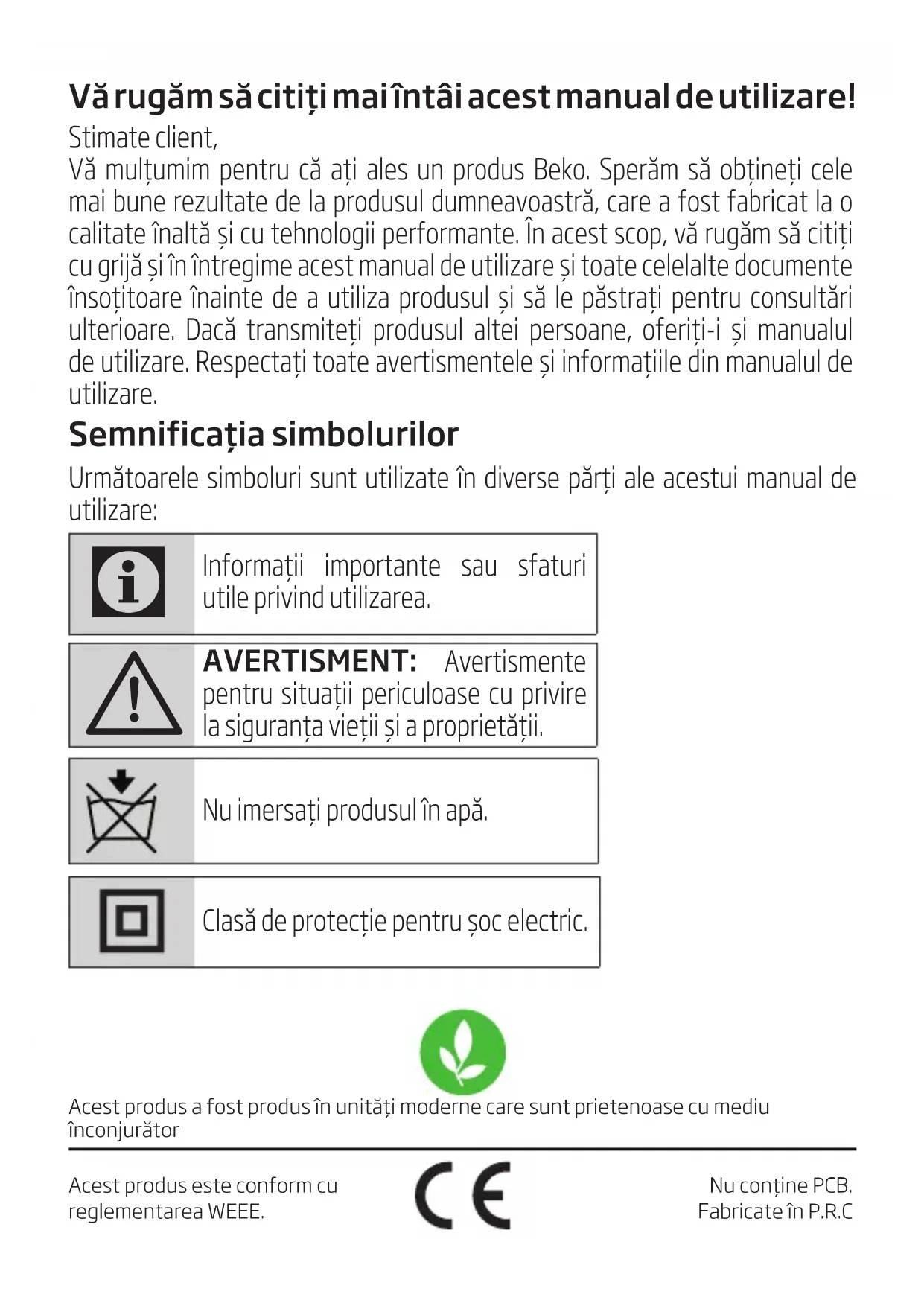 - Upuszczenie urządzenia może spowodować jego awarię lub trwałe uszkodzenie.Vă rugăm să citiţi mai întâi acest manual de utilizare! Stmate clent, Vă mulţumm pentru că aţ ales un produs Beko. Sperăm să obţneţ cele ma bune rezultate de la produsul dumneavoastră, care a fost fabrcat la o caltate înaltă ş cu tehnolog performante. În acest scop, vă rugăm să ctţ cu grjă ş în întregme acest manual de utlzare ş toate celelalte documente însoţtoare înante de a utlza produsul ş să le păstraţ pentru consultăr ulteroare. Dacă transmteţ produsul alte persoane, oferţ- ş manualul de utlzare. Respectaţ toate avertsmentele ş nformaţle dn manualul de utlzare. Semnificaţia simbolurilor Următoarele simboluri sunt utilizate în diverse părţi ale acestui manual de utilizare: