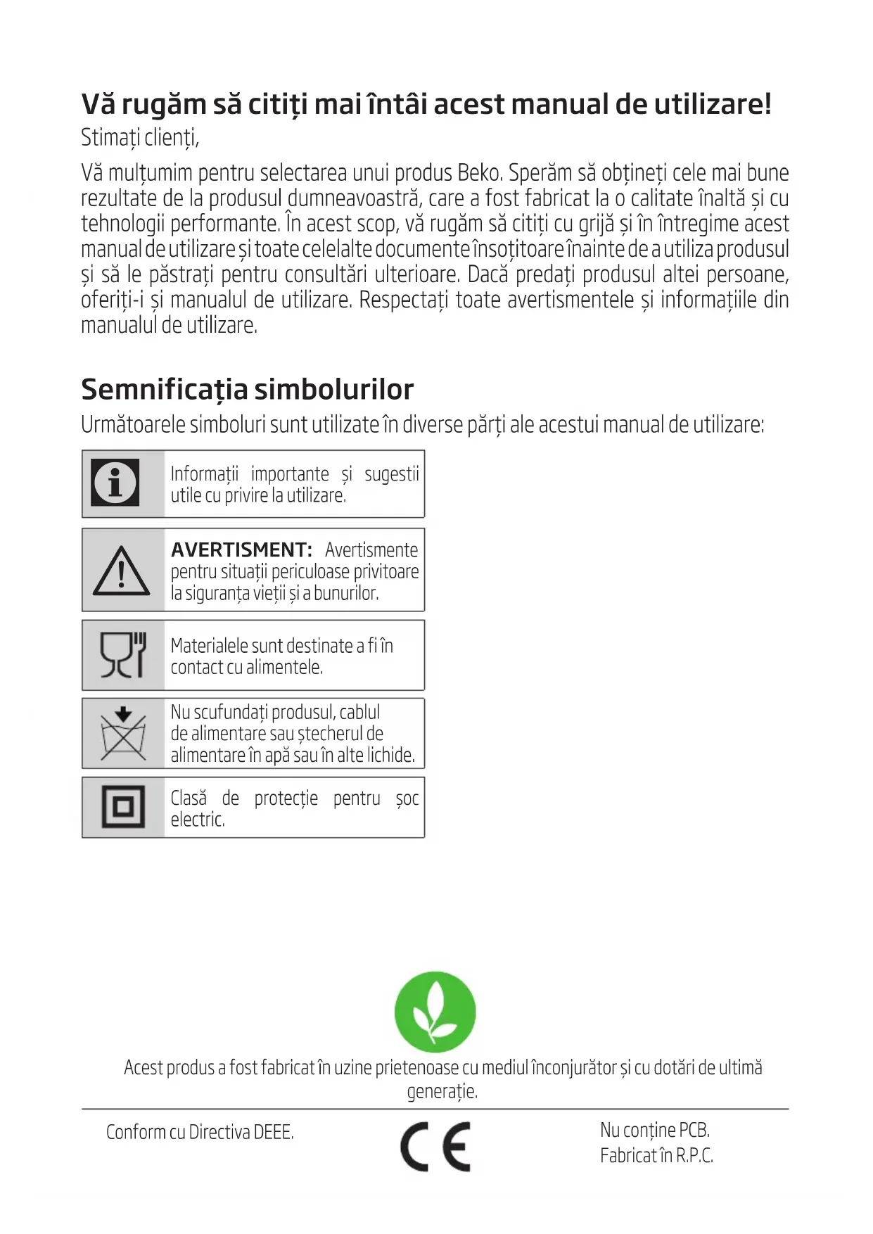Prima di contattare l’assistenza tecnica, al ne di agevolare la gestione della chiamata, è necessario avere a portata di mano il modello del prodotto e il documento scale di acquisto.Vă rugăm să citiți mai întâi acest manual de utilizare! Stimați clienți, Vă mulțumim pentru selectarea unui produs Beko. Sperăm să obţineţi cele mai bune rezultate de la produsul dumneavoastră, care a fost fabricat la o calitate înaltă şi cu tehnologii performante. În acest scop, vă rugăm să citiți cu grijă şi în întregime acest manual de utilizare şi toate celelalte documente însoțitoare înainte de a utiliza produsul şi să le păstrați pentru consultări ulterioare. Dacă predați produsul altei persoane, oferiți-i şi manualul de utilizare. Respectați toate avertismentele şi informațiile din manualul de utilizare. Semnificația simbolurilor Următoarele simboluri sunt utilizate în diverse părți ale acestui manual de utilizare: