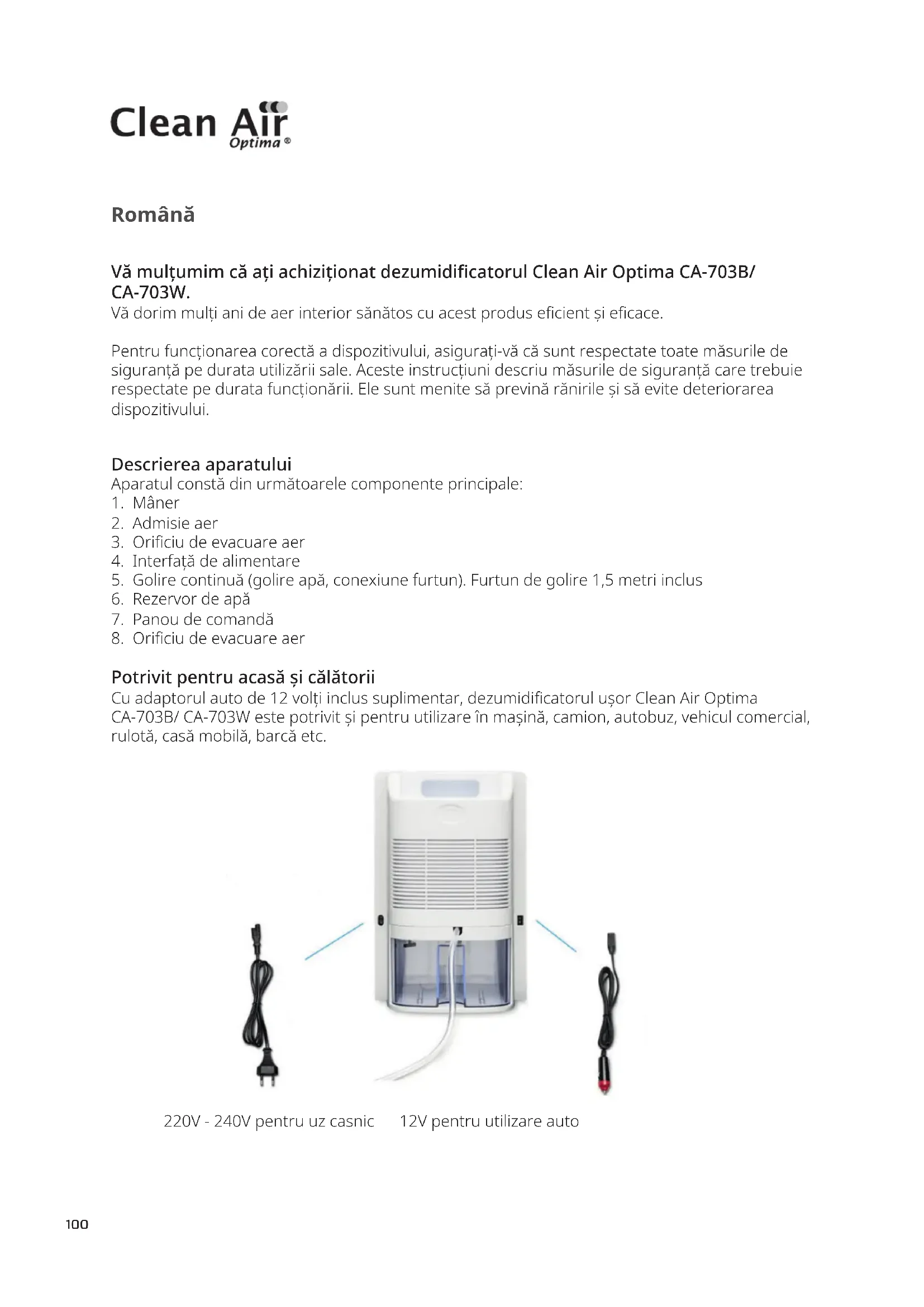 Potrivit pentru acasă și călătorii Cu adaptorul auto de 12 volți inclus suplimentar, dezumidicatorul ușor Clean Air Optima CA-703B/ CA-703W este potrivit și pentru utilizare în mașină, camion, autobuz, vehicul comercial, rulotă, casă mobilă, barcă etc. 220V - 240V pentru uz casnic 12V pentru utilizare auto101 Avertismente privind siguranța Acest dispozitiv poate utilizat numai în conformitate cu aceste instrucțiuni de siguranță. Luațiurmătoarele măsuri pentru a reduce riscul de vătămare corporală provocată, de exemplu, de șocuri electrice sau incendiu.