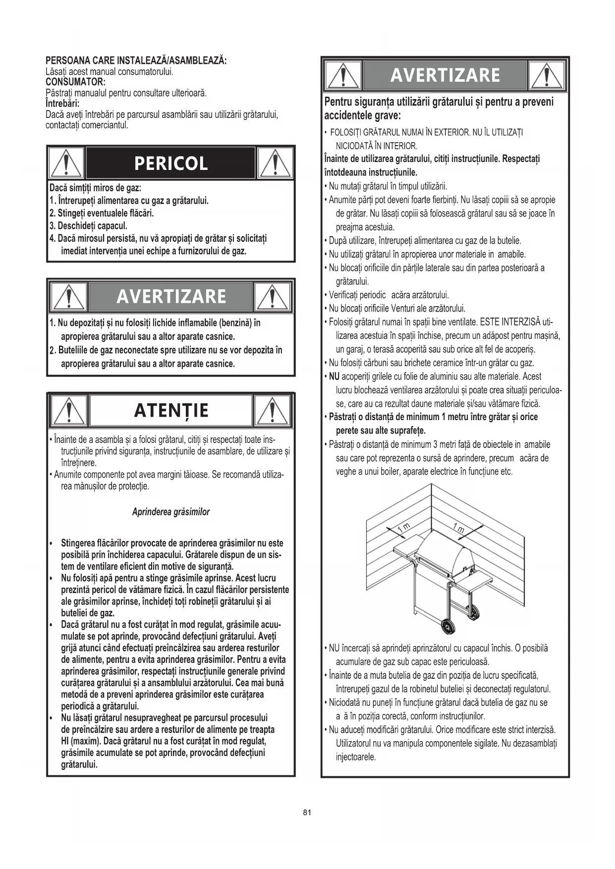 imediat intervenția unei echipe a furnizorului de gaz. Pentru siguranța utilizării grătarului și pentru a preveni accidentele grave: