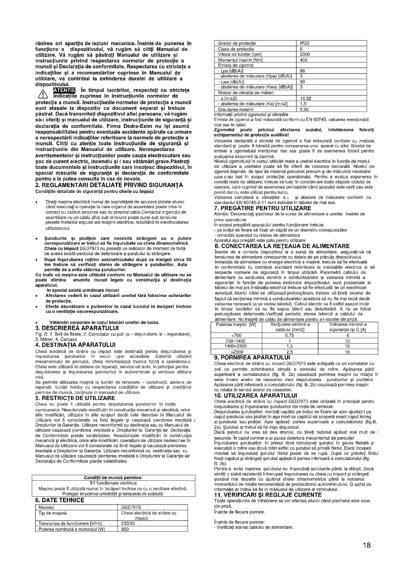electrice şi electronice Certificatul de Conformitate este anexat la manualul de utilizare ca un document separat. Dacă lipseşte Certificatul de Conformitate contactați-vă cu Dedra-Exim Sp. z o.o. Informații. Condițiile Generale de Siguranță au fost anexate la manualul de utilizare în formă de broşură separată. Condițiile detaliate de siguranță pentru aparatul descris s-a anexat la manualul de utilizare ATENTIE În timpul funcționării dispozitivului este întotdeauna obligatorie respectarea normelor generale de protecţie a muncii, pentru evitarea unui incendiu sau a electrocutării provocată de curentul electric sau a accidentelor cu urmări în18 rănirea ori apariția de leziuni mecanice. Înainte de punerea în funcțiune a dispozitivului, vă rugăm să citiți Manualul de utilizare. Vă rugăm să păstrați Manualul de utilizare și instrucțiunile privind respectarea normelor de protecţie a muncii și Declarația de conformitate. Respectarea cu strictețe a indicațiilor și a recomandărilor cuprinse în Manualul de utilizare, va contribui la extinderea duratei de utilizare a dispozitivului. ATENTIE În timpul lucrărilor, respectați cu strictețe indicațiile cuprinse în instrucțiunile normelor de protecţie a muncii. Instrucțiunile normelor de protecţie a muncii sunt atașate la dispozitiv ca document separat și trebuie păstrat. Dacă transmiteți dispozitivul altei persoane, vă rugăm să-i oferiți și manualul de utilizare, instrucțiunile de siguranță și declarația de conformitate. Firma Dedra-Exim nu își asumă responsabilitatea pentru eventuale accidente apărute ca urmare a nerespectării indicațiilor referitoare la normele de protecție a muncii. Citiți cu atenție toate instrucțiunile de siguranță și instrucțiunile din Manualul de utilizare. Nerespectarea avertismentelor și instrucțiunilor poate cauza electrocutare sau șoc de curent electric, incendiu și / sau vătămări grave.Păstrați toate ducumentele și instrucțiunile care însoțesc dispozitivul, în special măsurile de siguranță și declarația de conformitate pentru a le putea consulta în caz de nevoie.