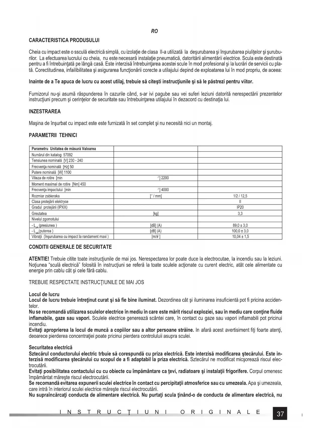 CARACTERISTICA PRODUSULUI Cheia cu impact este o ssculă electrică simplă, cu izolaţie de clasa II-a utilizată la deşurubarea şi înşurubarea piuliţelor şi şurubu- rilor. La efectuarea lucrului cu cheia, nu este necesară instalaţie pneumatică, datoritării alimentării electrice. Scula este destinată pentru a fi întrebuinţată pe lângă casă. Este interzisă întrebuinţarea acestei scule în mod profesional şi la lucrări de servicii cu pla- tă. Corectitudinea, infailibilitatea şi asigurarea funcţionării corecte a utilajului depind de exploatarea lui în mod propriu, de aceea: Inainte de a Te apuca de lucru cu acest utilaj, trebuie să citeşti instrucţiunile şi să le păstrezi pentru viitor. Furnizorul nu-şi asumă răspunderea în cazurile când, s-ar ivi pagube sau vei suferi leziuni datorită nerespectării prezentelor instrucţiuni precum şi cerinţelor de securitate sau întrebuinţarea utilajului în dezacord cu destinaţia lui. INZESTRAREA Maşina de înşurbat cu impact este este furnizată în set complet şi nu necesită nici un montaj. PARAMETRII TEHNICI Parametru Unitatea de măsură Valoarea Numărul din katalog 57092 Tensiunea nominală [V] 230 - 240 Frecvenţa nominală [Hz] 50 Putere nominală [W] 1100 Viteza de rotire [min