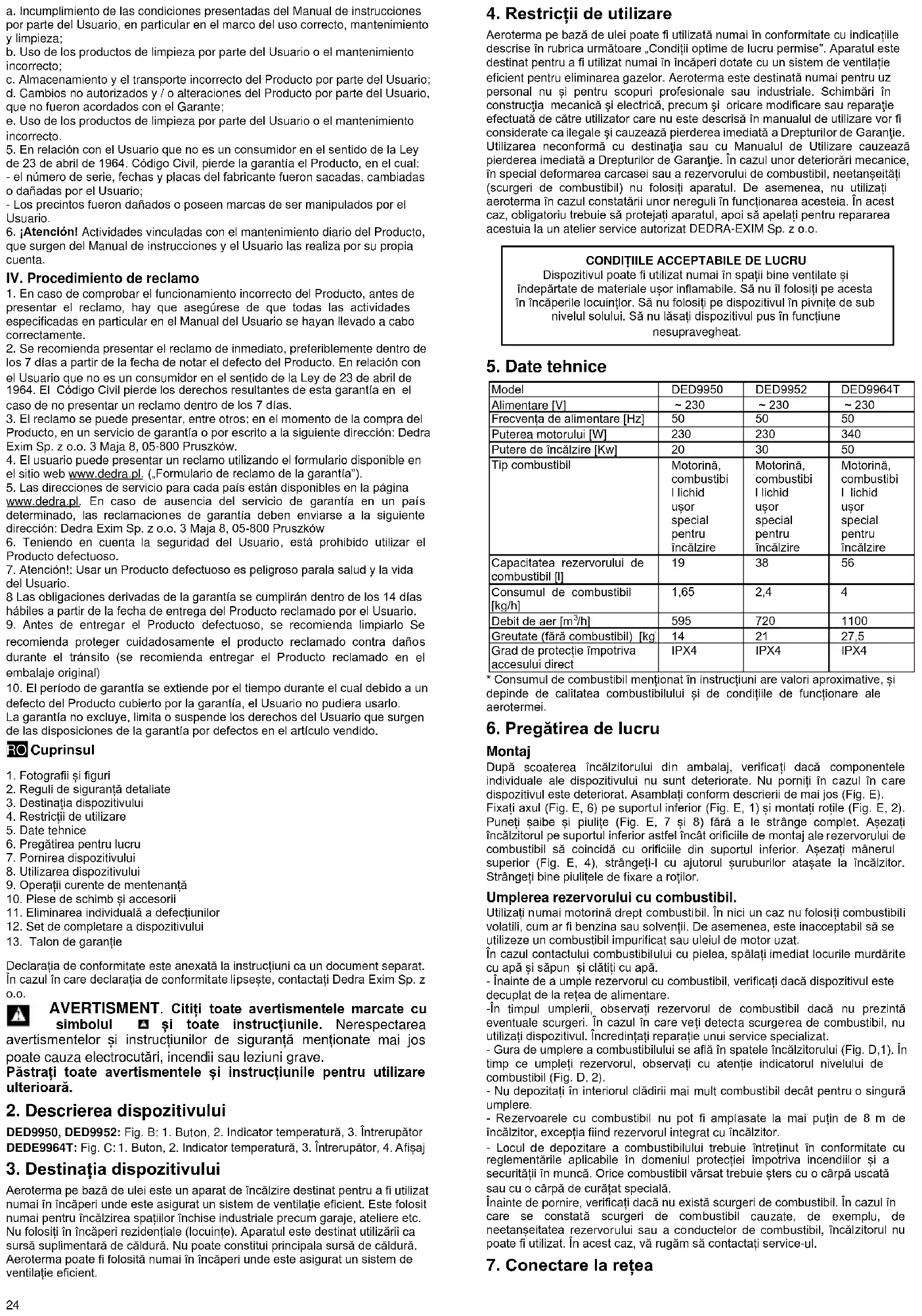 Aeroterma pe bază de ulei poate fi utilizată numai în conformitate cu indicațiile descrise în rubrica următoare „Condiții optime de lucru permise”. Aparatul este destinat pentru a fi utilizat numai în încăperi dotate cu un sistem de ventilație eficient pentru eliminarea gazelor. Aeroterma este destinată numai pentru uz personal nu și pentru scopuri profesionale sau industriale. Schimbări în construcţia mecanică şi electrică, precum şi oricare modificare sau reparaţie efectuată de către utilizator care nu este descrisă în manualul de utilizare vor fi considerate ca ilegale şi cauzează pierderea imediată a Drepturilor de Garanţie. Utilizarea neconformă cu destinaţia sau cu Manualul de Utilizare cauzează pierderea imediată a Drepturilor de Garanţie. În cazul unor deteriorări mecanice, în special deformarea carcasei sau a rezervorului de combustibil, neetanșeități (scurgeri de combustibil) nu folosiți aparatul. De asemenea, nu utilizați aeroterma în cazul constatării unor nereguli în funcționarea acesteia. În acest caz, obligatoriu trebuie să protejați aparatul, apoi să apelați pentru repararea acestuia la un atelier service autorizat DEDRA-EXIM Sp. z o.o.