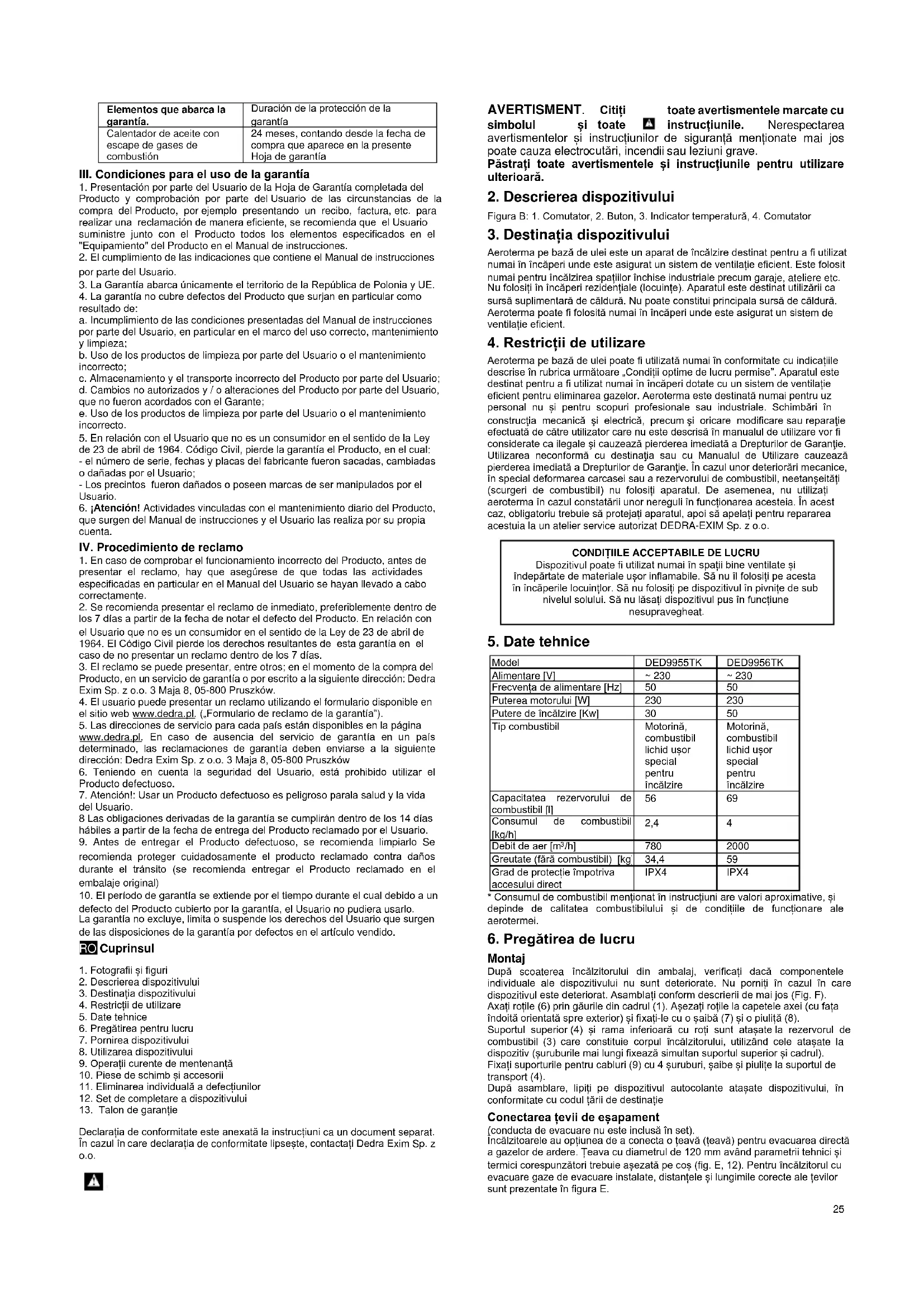 Aeroterma pe bază de ulei poate fi utilizată numai în conformitate cu indicațiile descrise în rubrica următoare „Condiții optime de lucru permise”. Aparatul este destinat pentru a fi utilizat numai în încăperi dotate cu un sistem de ventilație eficient pentru eliminarea gazelor. Aeroterma este destinată numai pentru uz personal nu și pentru scopuri profesionale sau industriale. Schimbări în construcţia mecanică şi electrică, precum şi oricare modificare sau reparaţie efectuată de către utilizator care nu este descrisă în manualul de utilizare vor fi considerate ca ilegale şi cauzează pierderea imediată a Drepturilor de Garanţie. Utilizarea neconformă cu destinaţia sau cu Manualul de Utilizare cauzează pierderea imediată a Drepturilor de Garanţie. În cazul unor deteriorări mecanice, în special deformarea carcasei sau a rezervorului de combustibil, neetanșeități (scurgeri de combustibil) nu folosiți aparatul. De asemenea, nu utilizați aeroterma în cazul constatării unor nereguli în funcționarea acesteia. În acest caz, obligatoriu trebuie să protejați aparatul, apoi să apelați pentru repararea acestuia la un atelier service autorizat DEDRA-EXIM Sp. z o.o.