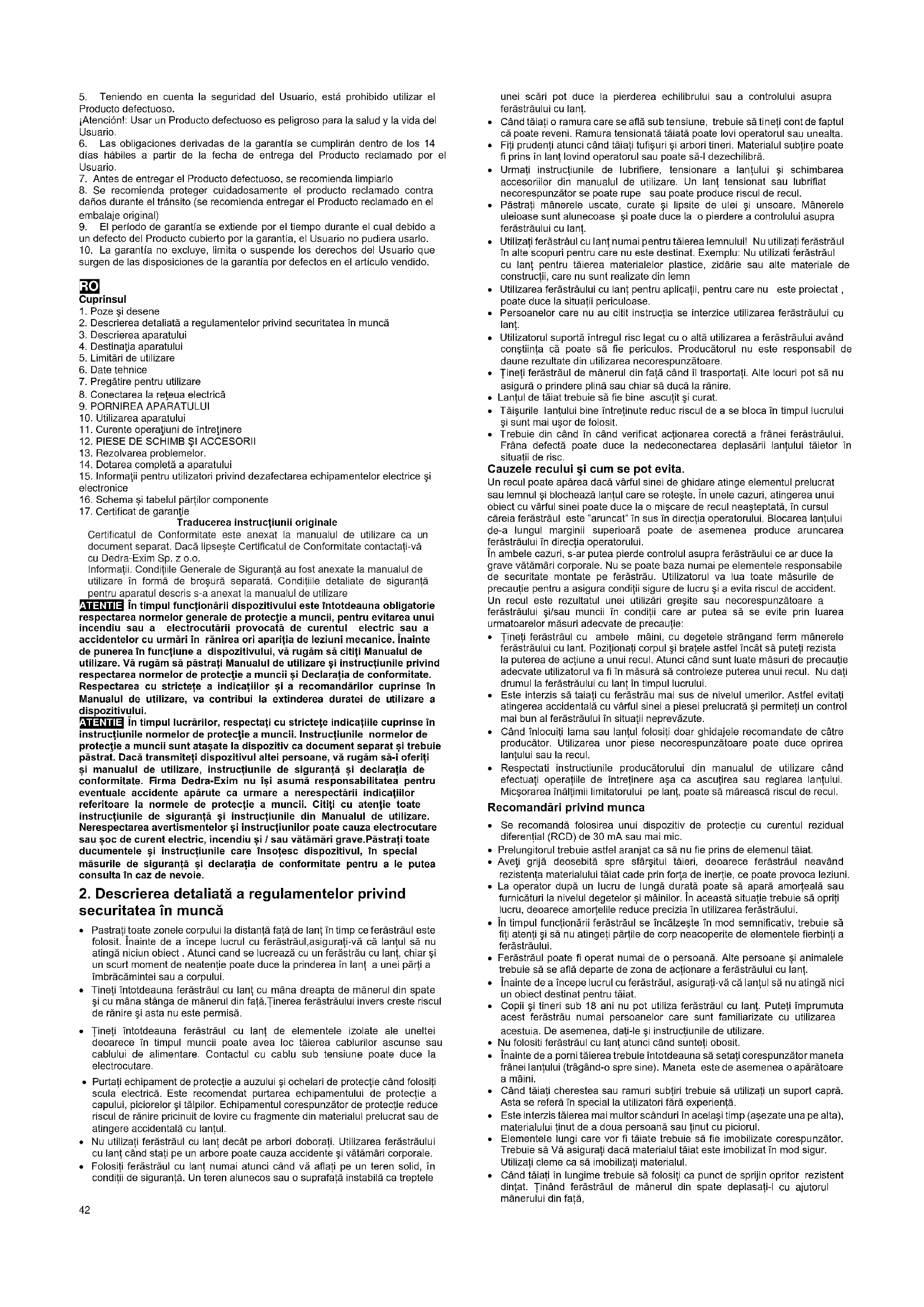Traducerea instrucțiunii originale Certificatul de Conformitate este anexat la manualul de utilizare ca un document separat. Dacă lipseşte Certificatul de Conformitate contactați-vă cu Dedra-Exim Sp. z o.o. Informații. Condițiile Generale de Siguranță au fost anexate la manualul de utilizare în formă de broşură separată. Condițiile detaliate de siguranță pentru aparatul descris s-a anexat la manualul de utilizare ATENTIE În timpul funcționării dispozitivului este întotdeauna obligatorie respectarea normelor generale de protecţie a muncii, pentru evitarea unui incendiu sau a electrocutării provocată de curentul electric sau a accidentelor cu urmări în rănirea ori apariția de leziuni mecanice. Înainte de punerea în funcțiune a dispozitivului, vă rugăm să citiți Manualul de utilizare. Vă rugăm să păstrați Manualul de utilizare și instrucțiunile privind respectarea normelor de protecţie a muncii și Declarația de conformitate. Respectarea cu strictețe a indicațiilor și a recomandărilor cuprinse în Manualul de utilizare, va contribui la extinderea duratei de utilizare a dispozitivului. ATENTIE În timpul lucrărilor, respectați cu strictețe indicațiile cuprinse în instrucțiunile normelor de protecţie a muncii. Instrucțiunile normelor de protecţie a muncii sunt atașate la dispozitiv ca document separat și trebuie păstrat. Dacă transmiteți dispozitivul altei persoane, vă rugăm să-i oferiți și manualul de utilizare, instrucțiunile de siguranță și declarația de conformitate. Firma Dedra-Exim nu își asumă responsabilitatea pentru eventuale accidente apărute ca urmare a nerespectării indicațiilor referitoare la normele de protecție a muncii. Citiți cu atenție toate instrucțiunile de siguranță și instrucțiunile din Manualul de utilizare. Nerespectarea avertismentelor și instrucțiunilor poate cauza electrocutare sau șoc de curent electric, incendiu și / sau vătămări grave.Păstrați toate ducumentele și instrucțiunile care însoțesc dispozitivul, în special măsurile de siguranță și declarația de conformitate pentru a le putea consulta în caz de nevoie.