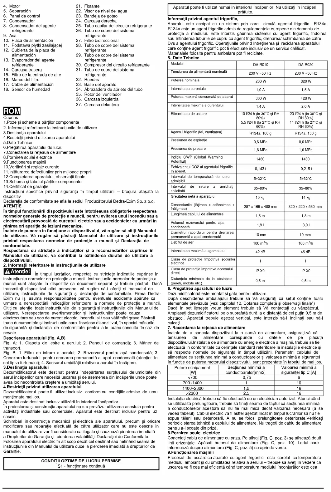 Modelul DA-R010 DA-R020 Tensiunea de alimentară nominală 230 V ~50 Hz 230 V ~50 Hz Puterea nominală 200 W 320 W Intensitatea curentului 1,0 A 1,5 A Puterea maximă consumată de aparat 300 W 420 W Intensitatea maximă a curentului 1,4 A 2,0 A Eficacitatea de uscare 10 l/24 h (la 30°C şi RH 80%) 5,5 l/24 h (la 27°C şi RH 60%) 20 l/24 h (la 30°C şi RH 80%) 11 l/24 h (la 27°C şi RH 60%) Agentul frigorific (fel, cantitatea) R134a, 100 g R134a, 150 g Presiunea de aspiraţie 0,6 MPa 0,6 MPa Presiunea de presare 1,6 MPa 1,6 MPa Indiciu GWP (Global Warming Potential)
