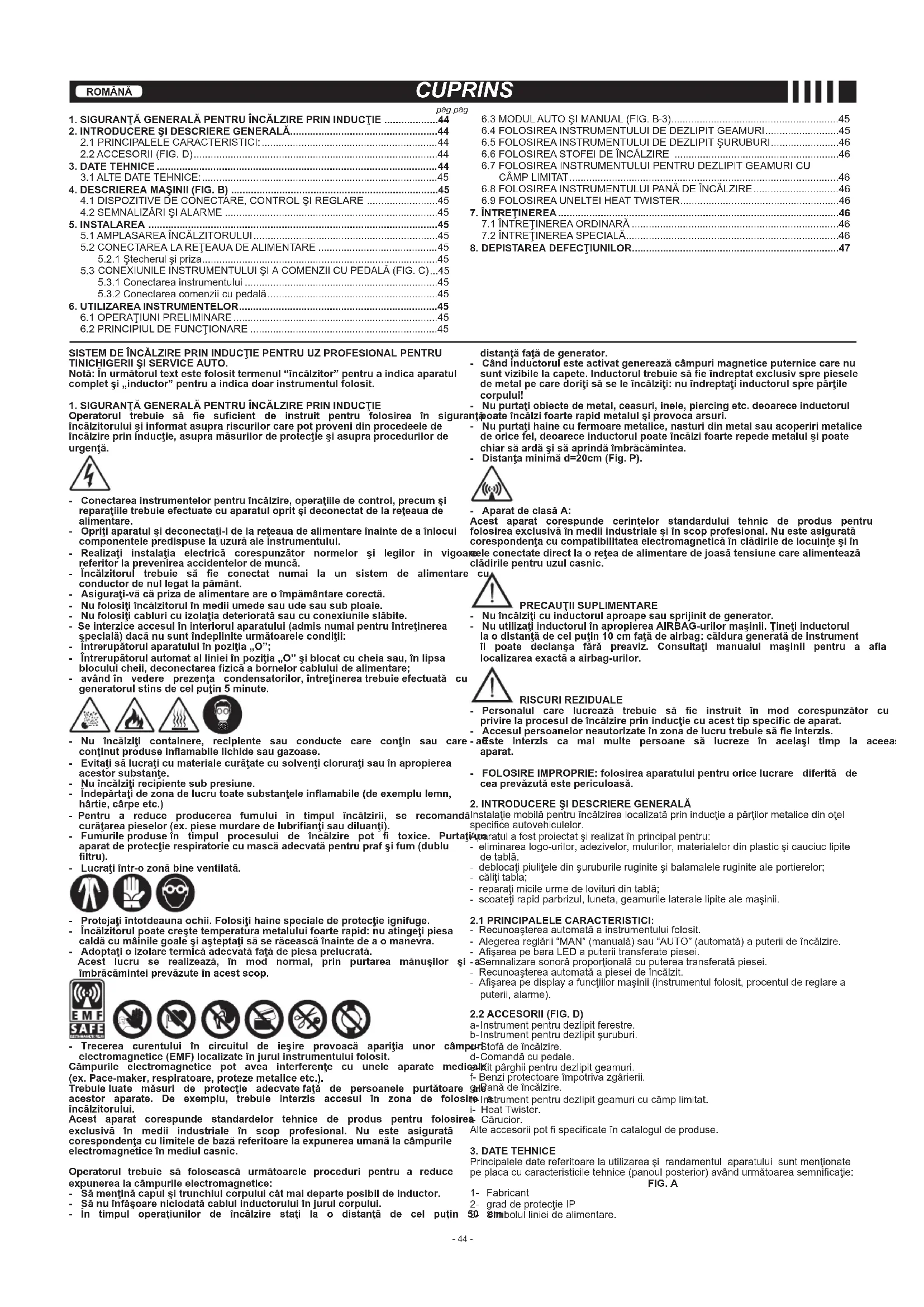Operatorul trebuie să e sucient de instruit pentru folosirea în siguranţă a încălzitoruluişiinformatasuprariscurilorcarepotprovenidinprocedeelede încălzireprininducţie,asupramăsurilordeprotecţieşiasupraprocedurilorde urgenţă. - Conectareainstrumentelorpentruîncălzire,operaţiiledecontrol,precumşi reparaţiiletrebuieefectuatecuaparatulopritşideconectatdelareţeauade alimentare. - Opriţiaparatulşideconectaţi-ldelareţeauadealimentareînaintedeaînlocui componentelepredispuselauzurăaleinstrumentului. - Realizaţi instalaţia electrică corespunzător normelor şi legilor in vigoare referitorlaprevenireaaccidentelordemuncă. - Încălzitorul trebuie să e conectat numai la un sistem de alimentare cu conductordenullegatlapământ. - Asiguraţi-văcăprizadealimentareareoîmpământarecorectă. - Nufolosiţiîncălzitorulînmediiumedesauudesausubploaie. - Nufolosiţicabluricuizolaţiadeterioratăsaucuconexiunileslăbite. -Seinterziceaccesulîninteriorulaparatului(admisnumaipentruîntreţinerea specială)dacănusuntîndepliniteurmătoarelecondiţii: - Întrerupătorulaparatuluiînpoziţia„O”; - Întrerupătorulautomatallinieiînpoziţia„O”şiblocatcucheiasau,înlipsa bloculuicheii,deconectareazicăabornelorcabluluidealimentare; - avândîn vedere prezenţa condensatorilor,întreţinereatrebuieefectuată cu generatorulstinsdecelpuţin5minute. - Nu încălziţi containere, recipiente sau conducte care conţin sau care au conţinutproduseinamabilelichidesaugazoase. - Evitaţisălucraţicumaterialecurăţatecusolvenţicloruraţisauînapropierea acestorsubstanţe. - Nuîncălziţirecipientesubpresiune. - Îndepărtaţidezonadelucrutoatesubstanţeleinamabile(deexemplulemn, hârtie,cârpeetc.) -Pentru a reduce producerea fumului în timpul încălzirii, se recomandă curăţareapieselor(ex.piesemurdaredelubrianţisaudiluanţi). - Fumurileproduseîn timpul procesului de încălzire pot toxice. Purtaţiun aparatdeprotecţierespiratoriecumascăadecvatăpentruprafşifum(dublu ltru). - Lucraţiîntr-ozonăbineventilată. - Protejaţiîntotdeaunaochii.Folosiţihainespecialedeprotecţieignifuge. - Încălzitorulpoatecreştetemperaturametaluluifoarterapid:nuatingeţipiesa caldăcumâinilegoaleşiaşteptaţisăserăceascăînaintedeaomanevra. - Adoptaţioizolaretermicăadecvatăfaţădepiesaprelucrată. Acest lucru se realizează, în mod normal, prin purtarea mănuşilor şi a îmbrăcăminteiprevăzuteînacestscop. - Trecerea curentului în circuitul de ieşire provoacă apariţia unor câmpuri electromagnetice(EMF)localizateînjurulinstrumentuluifolosit. Câmpurile electromagnetice pot avea interferenţe cu unele aparate medicale (ex.Pace-maker,respiratoare,protezemetaliceetc.). Trebuieluate măsuri de protecţie adecvatefaţă de persoanele purtătoare ale acestor aparate. De exemplu, trebuie interzis accesul în zona de folosire a încălzitorului. Acest aparat corespunde standardelor tehnice de produs pentru folosirea exclusivă în medii industriale în scop profesional. Nu este asigurată corespondenţaculimiteledebazăreferitoarelaexpunereaumanălacâmpurile electromagneticeînmediulcasnic. Operatorul trebuie să folosească următoarele proceduri pentru a reduce expunerealacâmpurileelectromagnetice: - Sămenţinăcapulşitrunchiulcorpuluicâtmaideparteposibildeinductor. - Sănuînfăşoareniciodatăcablulinductoruluiînjurulcorpului. - În timpul operaţiunilor de încălzire staţi la o distanţă de cel puţin 50 cm distanţăfaţădegenerator. - Cândinductorulesteactivatgenereazăcâmpurimagneticeputernicecarenu suntvizibilelacapete.Inductorultrebuiesăeîndreptatexclusivsprepiesele demetalpecaredoriţisăseleîncălziţi:nuîndreptaţiinductorulsprepărţile corpului! - Nupurtaţiobiectedemetal,ceasuri,inele,piercingetc.deoareceinductorul poateîncălzifoarterapidmetalulşiprovocaarsuri. - Nupurtaţihainecufermoaremetalice,nasturidinmetalsauacoperirimetalice deoricefel,deoareceinductorulpoateîncălzifoarterepedemetalulşipoate chiarsăardăşisăaprindăîmbrăcămintea. - Distanţaminimăd=20cm(Fig.P). - AparatdeclasăA: Acest aparat corespunde cerinţelor standardului tehnic de produs pentru folosireaexclusivăînmediiindustrialeşiînscopprofesional.Nuesteasigurată corespondenţacucompatibilitateaelectromagneticăînclădiriledelocuinţeşiîn celeconectatedirectlaoreţeadealimentaredejoasătensiunecarealimentează clădirilepentruuzulcasnic. PRECAUŢIISUPLIMENTARE - Nuîncălziţicuinductorulaproapesausprijinitdegenerator. - NuutilizaţiinductorulînapropiereaAIRBAG-urilormaşinii.Ţineţiinductorul laodistanţădecelpuţin10cmfaţădeairbag:căldurageneratădeinstrument îl poate declanşa fără preaviz. Consultaţi manualul maşinii pentru a aa localizareaexactăaairbag-urilor. RISCURI REZIDUALE - Personalul care lucrează trebuie să e instruit în mod corespunzător cu privirelaprocesuldeîncălzireprininducţiecuacesttipspecicdeaparat. - Accesulpersoanelorneautorizateînzonadelucrutrebuiesăeinterzis. - Este interzis ca mai multe persoane să lucreze în acelaşi timp la aceeaşi aparat. - FOLOSIREIMPROPRIE:folosireaaparatuluipentruoricelucrare diferită de ceaprevăzutăestepericuloasă. 2.INTRODUCEREŞIDESCRIEREGENERALĂ Instalaţie mobilă pentru încălzirea localizată prin inducţie a părţilor metalice din oţel specice autovehiculelor. Aparatul a fost proiectat şi realizat în principal pentru: - eliminarea logo-urilor, adezivelor, mulurilor, materialelor din plastic şi cauciuc lipite de tablă. - deblocaţi piuliţele din şuruburile ruginite şi balamalele ruginite ale portierelor; - căliţi tabla; - reparaţi micile urme de lovituri din tablă; - scoateţi rapid parbrizul, luneta, geamurile laterale lipite ale maşinii. 2.1PRINCIPALELECARACTERISTICI: - Recunoaşterea automată a instrumentului folosit. - Alegerea reglării “MAN” (manuală) sau “AUTO” (automată) a puterii de încălzire. - Aşarea pe bara LED a puterii transferat