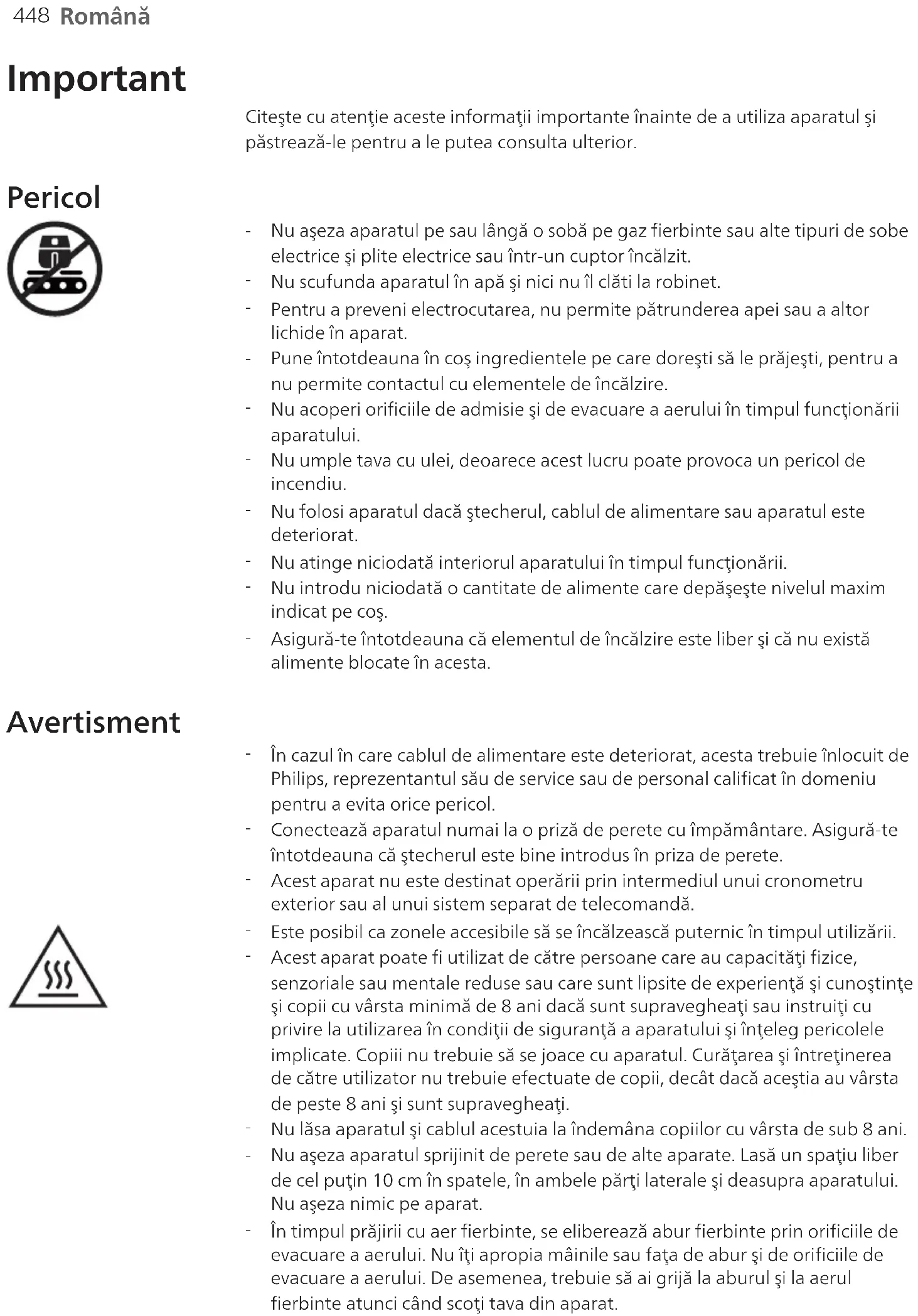 În timpul prăjirii cu aer fierbinte, se eliberează abur fierbinte prin orificiile de evacuare a aerului. Nu îţi apropia mâinile sau faţa de abur şi de orificiile de evacuare a aerului. De asemenea, trebuie să ai grijă la aburul şi la aerul fierbinte atunci când scoţi tava din aparat.449 Română