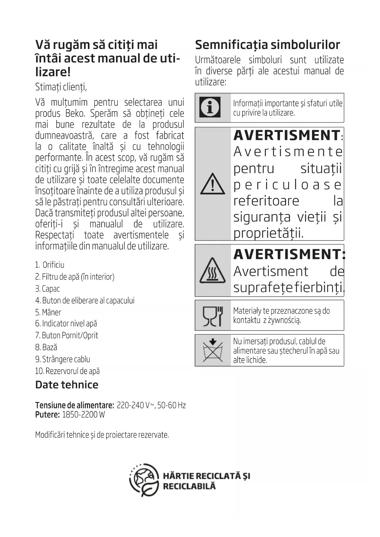 AVERTISMENT: Avertismente pentru situaţii periculoase referitoare la siguranţa vieţii și proprietăţii. AVERTISMENT: Avertisment de suprafeţe fierbinţi. Materiały te przeznaczone są do kontaktu z żywnością.Nu imersaţi produsul, cablul de alimentare sau ştecherul în apă sau alte lichide.1. Orificiu2. Filtru de apă (în interior)3. Capac4. Buton de eliberare al capacului5. Mâner6. Indicator nivel apă7. Buton Pornit/Oprit8. Bază 9. Strângere cablu10. Rezervorul de apă Date tehnice Tensiune de alimentare: 220-240 V~, 50-60 HzPutere: 1850-2200 WModificări tehnice şi de proiectare rezervate.55 / RO Fierbător / Manual de utilizare Vă rugăm să citiţi cu atenţie manualul de instrucţiuni înainte de utilizarea produsului! Urmaţi toate instrucţiunile de siguranţă pentru evitarea pericolele datorate unei utilizări necorespunzătoare! Păstraţi manualul de instrucţiuni pentru o viitoare utilizare. Dacă produsul va fi încredinţat unei terţe părţi, atunci şi manualul de instrucţiuni trebuie încredinţat.