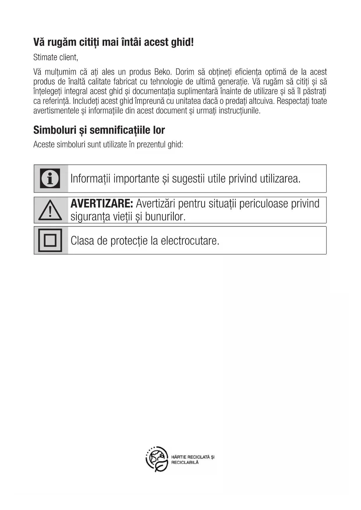- Si l’appareil tombe, il risque de ne plus fonctionner ou subir des dommages permanents.Vă rugăm citiți mai întâi acest ghid! Stimate client, Vă mulțumim că ați ales un produs Beko. Dorim să obțineți eficiența optimă de la acest produs de înaltă calitate fabricat cu tehnologie de ultimă generație. Vă rugăm să citiți și să înțelegeți integral acest ghid și documentația suplimentară înainte de utilizare și să îl păstrați ca referință. Includeți acest ghid împreună cu unitatea dacă o predați altcuiva. Respectați toate avertismentele și informațiile din acest document și urmați instrucțiunile. Simboluri și semnificațiile lor Aceste simboluri sunt utilizate în prezentul ghid: