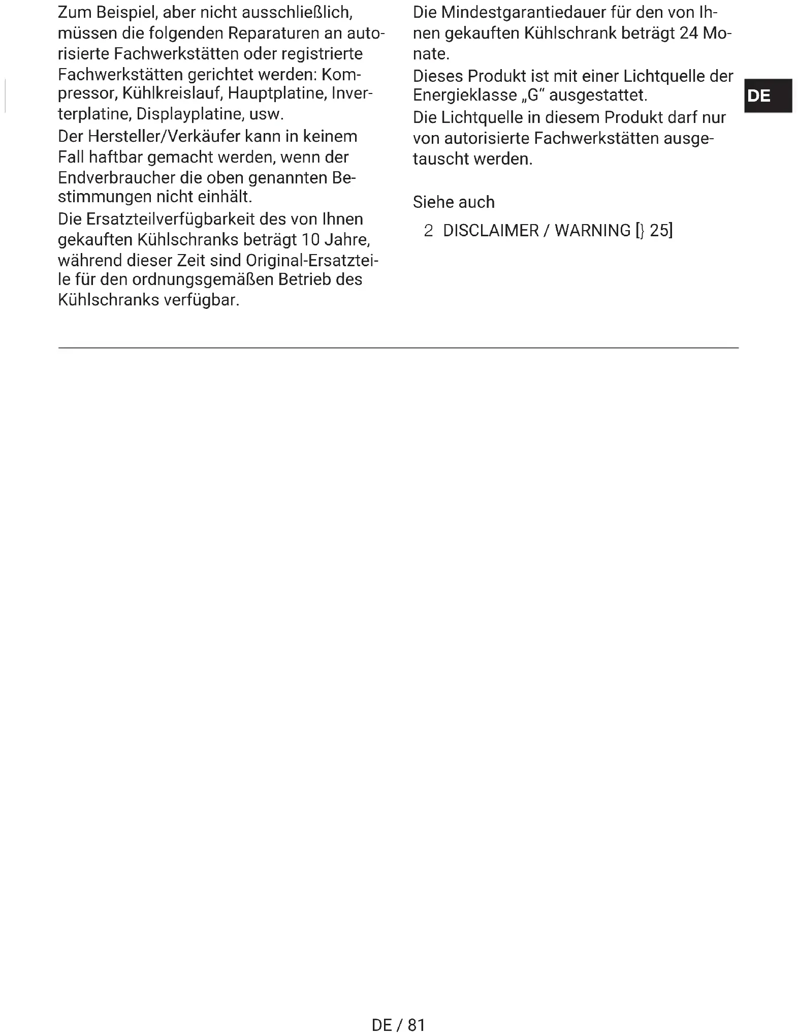 RORO / 106 instrucțiunile și lista de piese de schimb ale acestui produs de către producător conform metodelor descrise în actele legislative în conformitate cu Directiva 125/2009/CE. Cu toate acestea, numai agentul de service (adică mecanicii profesioniști autorizați) pe care îl puteți contacta de la numărul de telefon indicat în manualul de utilizare/cardul de garanție sau prin dealer-ul dumneavoastră autorizat poate asigura service-ul în condițiile garanției. Prin urmare, vă rugăm să rețineți că reparațiile efectuate de mecanici profesioniști (care nu sunt autorizați de) Beko vor duce la anularea garanției. Auto-repararea Auto-repararea poate fi efectuată de utilizatorul final cu privire la următoarele piese de schimb: mânere de uși, balamale uși, tăvi, coșuri și garnituri de ușă (o listă actualizată este disponibilăsupport.beko.com începând cu 1 martie 2021). Mai mult, pentru a asigura siguranța produsului și pentru a preveni riscul de vătămare gravă, auto-repararea menționată se va face urmând instrucțiunile din manualul de utilizare pentru auto-reparare sau care sunt disponibile în support.beko.com . Pentru siguranța dumneavoastră, scoateţi produsul din priză înainte de a încerca orice auto-reparare. Reparațiile și încercarea de reparații ale utilizatorilor finali pentru piesele care nu sunt incluse în această listă și/sau care nu respectă instrucțiunile din manualele de utilizare pentru auto-reparare sau care sunt disponibile în support.beko.com, ar putea ridica probleme de siguranță care nu pot fi atribuite Beko, și ar putea duce la anularea garanției produsului. Prin urmare, este recomandat cu tărie ca utilizatorii finali să se abțină de la încercarea de a efectua reparații care nu se încadrează în lista menționată de piese de schimb, contactând în astfel de cazuri mecanici profesioniști autorizați sau mecanici profesioniști înregistrați. În caz contrar, încercările de reparație efectuate de utilizatorii finali pot cauza probleme legate de siguranță, pot deteriora produsul și pot cauza incendii, inundații, electrocutări și grave vătămări corporale. Cu titlu de exemplu, dar fără a se limita la, următoarele reparații trebuie să fie adresate mecanicilor profesioniști autorizați sau mecanicilor profesioniști înregistrați: compresor, circuit de răcire, placa principală, placă invertor, placă de afișare etc. Producătorul/vânzătorul nu poate fi tras la răspundere în niciun caz în care utilizatorii finali nu respectă cele de mai sus. Disponibilitatea pieselor de schimb ale frigiderului pe care l-ați achiziționat este de 10 ani. În această perioadă, vor fi disponibile piese de schimb originale pentru ca frigiderul să funcţioneze corect. Durata minimă a garanției pentru frigiderul pe care l-ați achiziționat este de 24 de luni. Acest produs este prevăzut cu o sursă de iluminare de clasă energetică „G”. Sursa de iluminare a acestui produs trebuie înlocuită numai de mecanici profesionişti. Mai vezi şi
