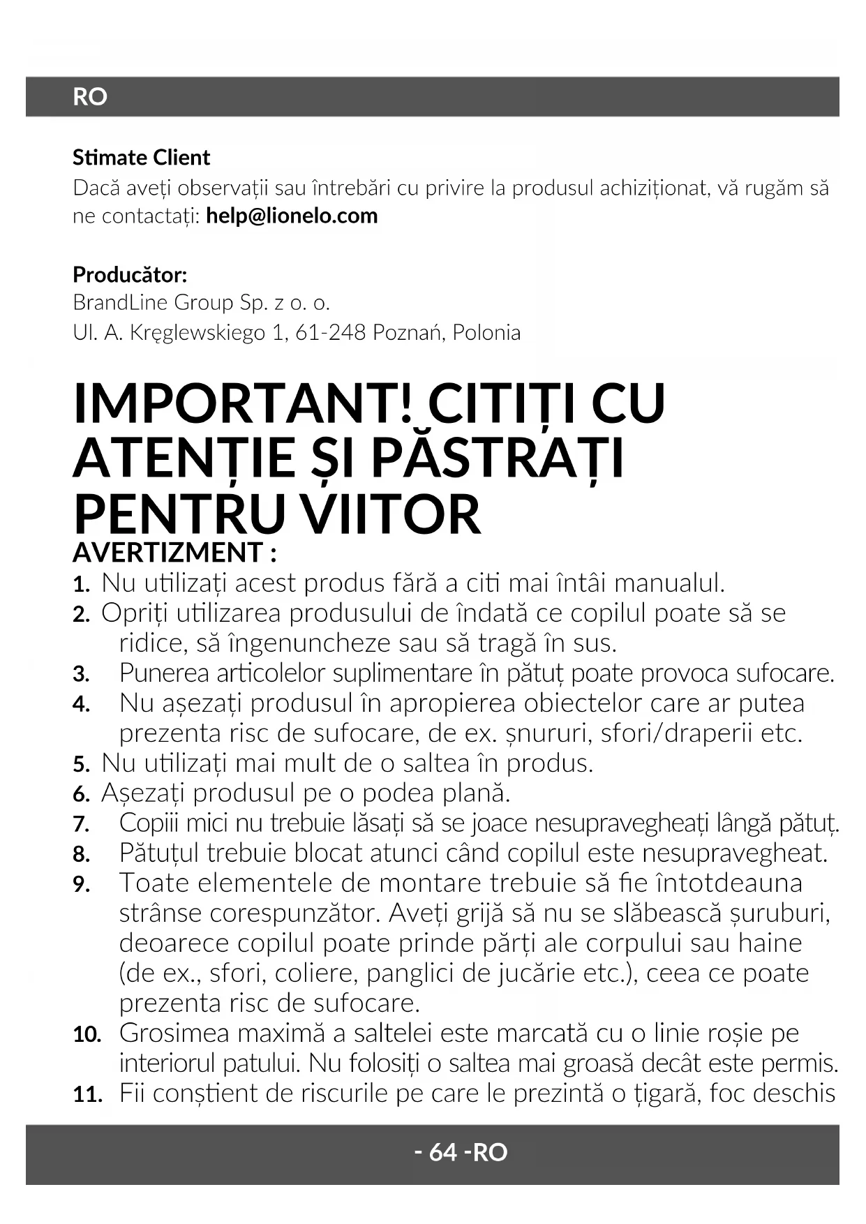 NU ulizați pătuțul dacă vreo parte lipsește, este crăpată sau deteriorată. Contactați Lionelo pentru piese de schimb și instrucțiuni, dacă este necesar. NU înlocuiți singur piesele din pătuț. AVERTIZMENTE pentru saltea
