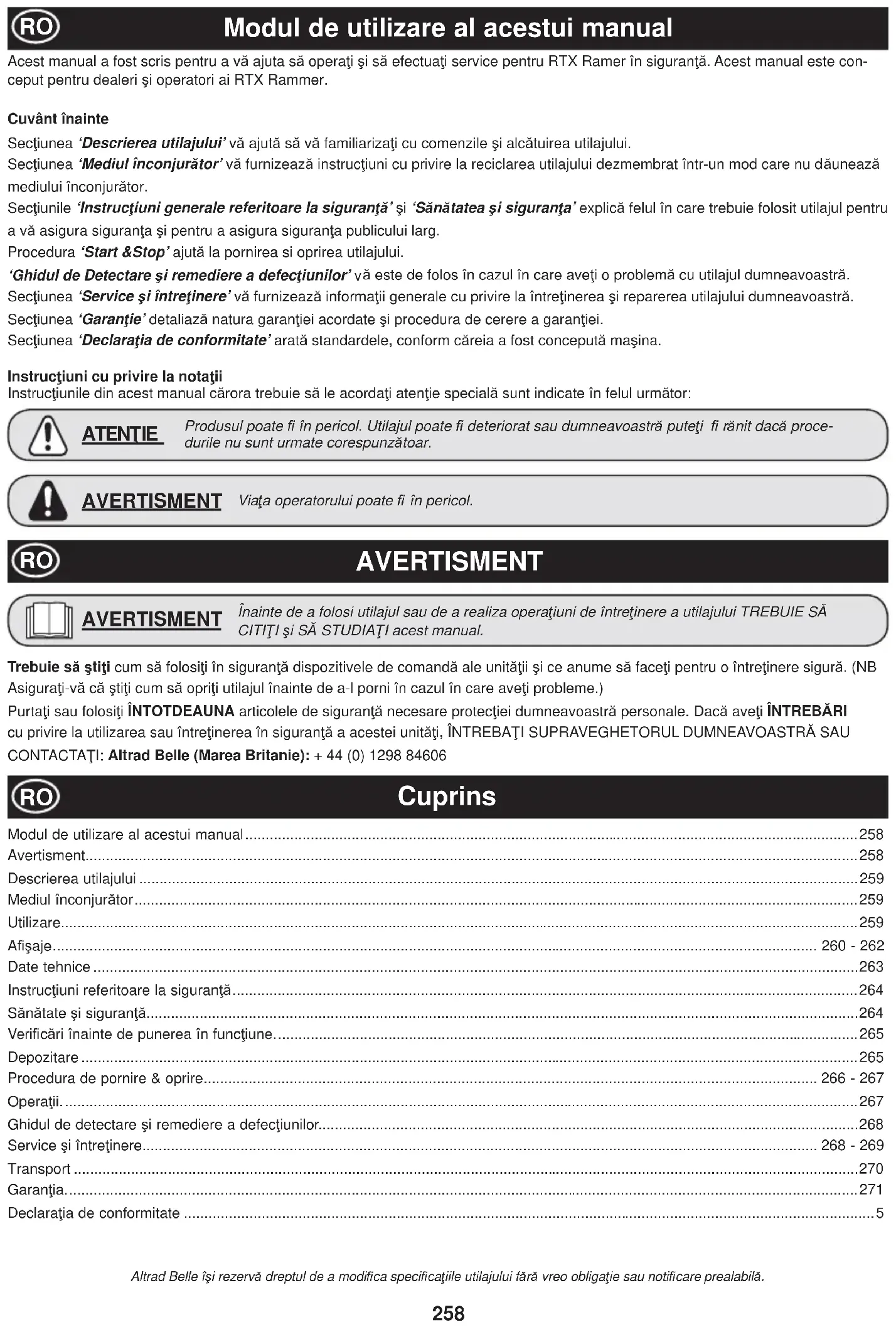 Acest manual a fost scris pentru a vă ajuta să operaĠi úi să efectuaĠi service pentru RTX Ramer în siguranĠă. Acest manual este con- ceput pentru dealeri úi operatori ai RTX Rammer. Cuvânt înainte SecĠiunea ‘Descrierea utilajului’ vă ajută să vă familiarizaĠi cu comenzile úi alcătuirea utilajului. SecĠiunea ‘Mediul înconjurător’ vă furnizează instrucĠiuni cu privire la reciclarea utilajului dezmembrat într-un mod care nu dăunează mediului înconjurător. SecĠiunile ‘InstrucĠiuni generale referitoare la siguranĠă’ úi ‘Sănătatea úi siguranĠa’ explică felul în care trebuie folosit utilajul pentru a vă asigura siguranĠa úi pentru a asigura siguranĠa publicului larg. Procedura ‘Start &Stop’ ajută la pornirea si oprirea utilajului. ‘Ghidul de Detectare úi remediere a defecĠiunilor’ v ă este de folos în cazul în care aveĠi o problemă cu utilajul dumneavoastră. SecĠiunea ‘Service úi întreĠinere’ vă furnizează informaĠii generale cu privire la întreĠinerea úi reparerea utilajului dumneavoastră. SecĠiunea ‘GaranĠie’ detaliază natura garanĠiei acordate úi procedura de cerere a garanĠiei. SecĠiunea ‘DeclaraĠia de conformitate’ arată standardele, conform căreia a fost concepută maúina. InstrucĠiuni cu privire la notaĠii InstrucĠiunile din acest manual cărora trebuie să le acordaĠi atenĠie specială sunt indicate în felul următor: ViaĠa operatorului poate ¿ în pericol. AVERTISMENT Produsul poate ¿ în pericol. Utilajul poate ¿ deteriorat sau dumneavoastră puteĠi ¿ rănit dacă proce- durile nu sunt urmate corespunzătoar. ATENğIE AVERTISMENT