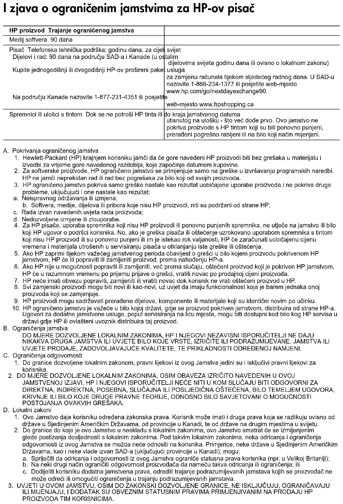RESTRICŢIONEAZĂ SAU MODIFICĂ, ŞI SUNT SUPLIMENTARI FAŢĂ DE, DREPTURILE STATUTARE OBLIGATORII APLICABILE VÂNZĂRILOR DE PRODUSE HP CĂTRE CLIENŢI. Garanţia producătorului HP Stimate Client, Mai jos am inclus numele şi adresa entităţii HP care este responsabilă cu îndeplinirea obligaţiilor aferente Garanţiei producătorului HP în ţara dvs. Aveţi drepturi legale suplimentare împotriva vânzătorului pe baza contractului de achiziţie. Aceste drepturi nu sunt afectate de Garanţia producătorului HP. Vă rugăm să contactaţi vânzătorul. Hewlett-Packard Romănia SRL Bd. Lascăr Catargiu nr. 47-53, Europe House Business Center, Et 3, Sector 1, Bucureşti Produs HP Durata garanţiei limitate Suportul software-ului 90 de zile Imprimantă Asistenţă tehnică prin telefon: 1 an în întreaga lume Componente şi manoperă: 90 de zile în SUA şi Canada (în afara SUA şi a Canadei 1 an sau conform legislaţiei locale) Cumpăraţi un Plan de service extins HP de schimb în următoarea zi lucrătoare de un an sau doi. În SUA, sunaţi la 1-866-234-1377 sau vizitaţi www.hp.com/go/nextdayexchange90. Clienţii canadieni pot suna la 1-877-231-4351 sau pot vizita www.hpshopping.ca Cartuşe de imprimare sau cartuşe de cerneală Până la golirea de cerneală HP sau până la data de „sfârşit al garanţiei” care este imprimată pe cartuş, indiferent care dintre cele două cazuri apare mai întâi. Această garanţie nu acoperă produsele cu cerneală HP care au fost reîncărcate, refăcute, remediate, utilizate în mod neadecvat sau care au fost desfăcute. Declaraţie de garanţie limitată a imprimantei HPČrna kartušaTribarvna kartuša