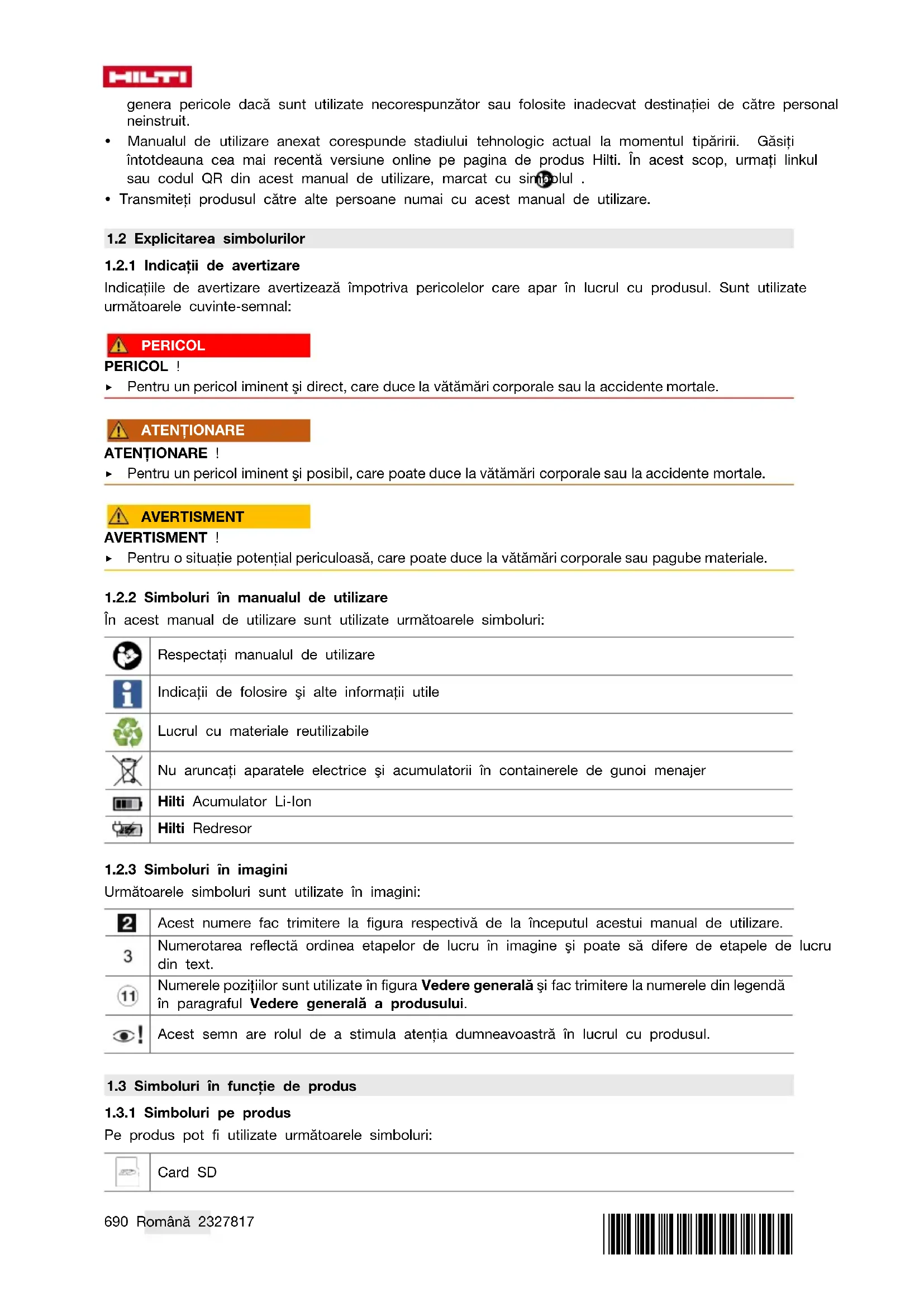 În acest manual de utilizare sunt utilizate următoarele simboluri: Respectaţi manualul de utilizare Indicaţii de folosire şi alte informaţii utile Lucrul cu materiale reutilizabile Nu aruncaţi aparatele electrice şi acumulatorii în containerele de gunoi menajer Hilti Acumulator LiIon Hilti Redresor