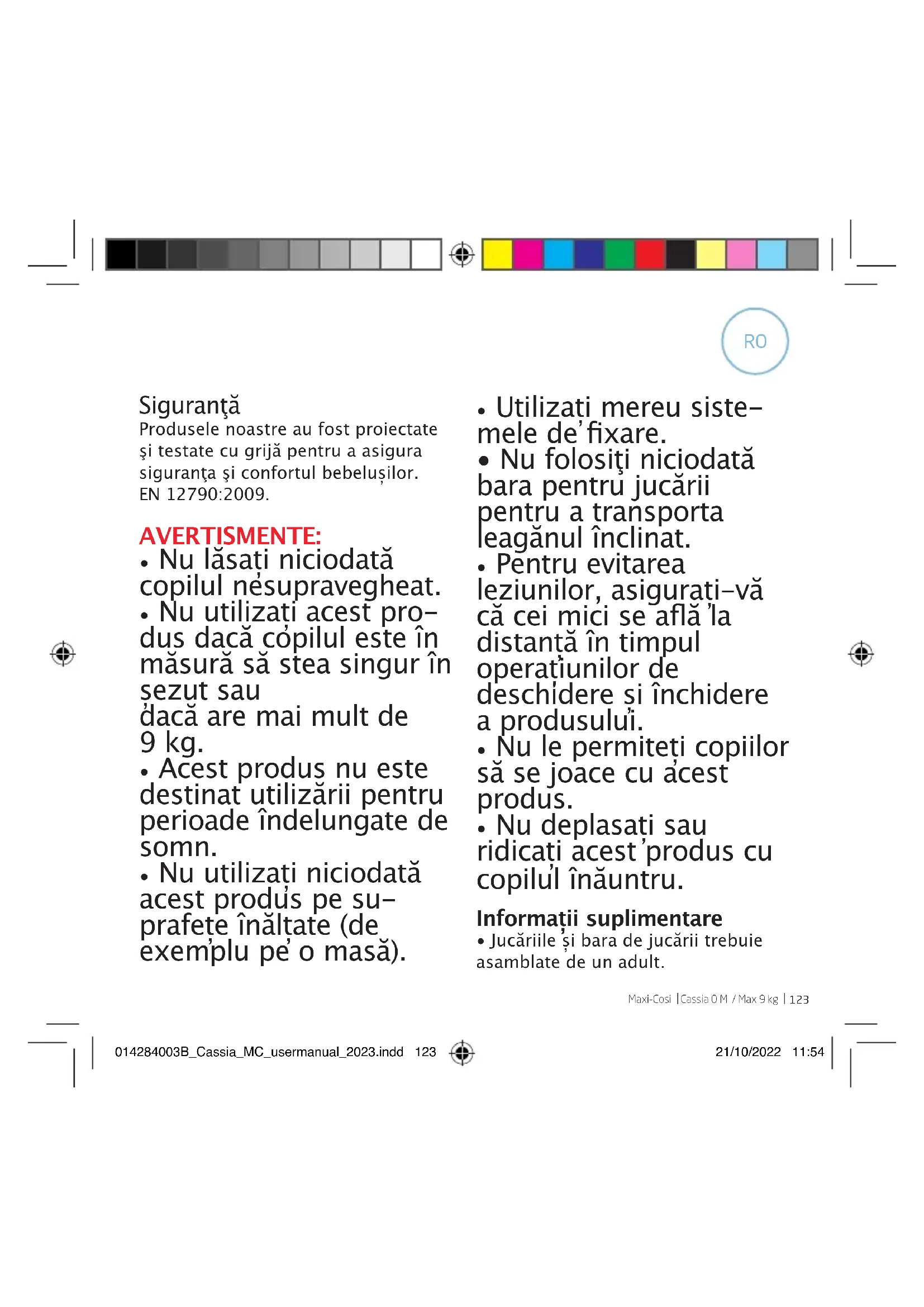Siguranţă Produsele noastre au fost proiectate şi testate cu grijă pentru a asigura siguranţa şi confortul bebelușilor. EN 12790:2009. AVERTISMENTE: