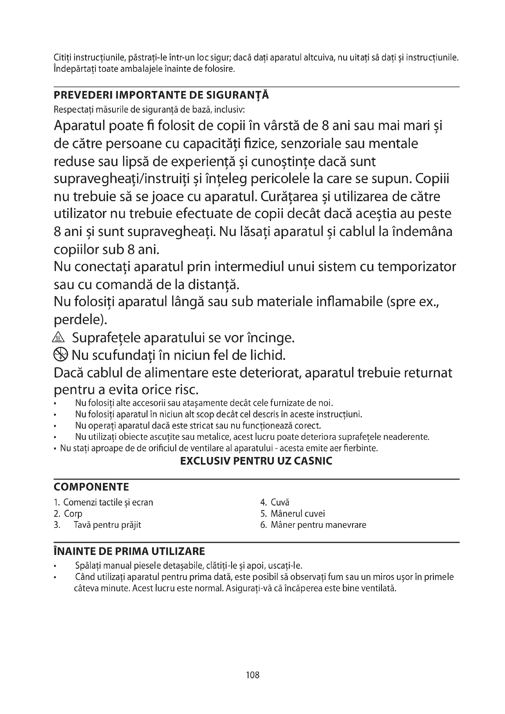 Respectați măsurile de siguranță de bază, inclusiv: Aparatul poate fi folosit de copii în vârstă de 8 ani sau mai mari și de către persoane cu capacități fizice, senzoriale sau mentale reduse sau lipsă de experiență și cunoștințe dacă sunt supravegheați/instruiți și înțeleg pericolele la care se supun. Copiii nu trebuie să se joace cu aparatul. Curățarea și utilizarea de către utilizator nu trebuie efectuate de copii decât dacă aceștia au peste 8 ani și sunt supravegheați. Nu lăsați aparatul și cablul la îndemâna copiilor sub 8 ani. Nu conectați aparatul prin intermediul unui sistem cu temporizator sau cu comandă de la distanță. Nu folosiți aparatul lângă sau sub materiale inflamabile (spre ex., perdele). ¬ Suprafețele aparatului se vor încinge. i Nu scufundați în niciun fel de lichid. Dacă cablul de alimentare este deteriorat, aparatul trebuie returnat pentru a evita orice risc.