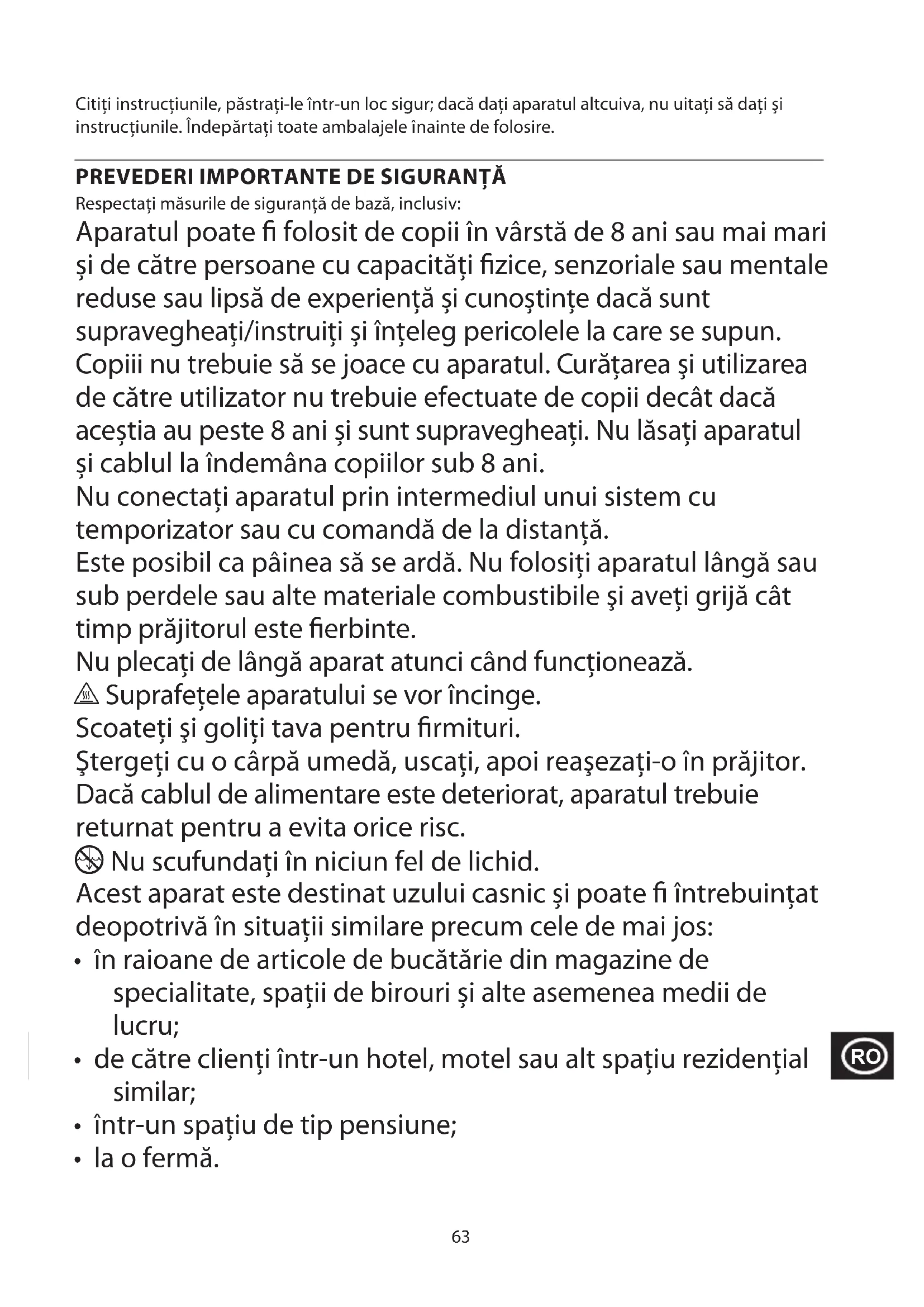 Respectați măsurile de siguranță de bază, inclusiv: Aparatul poate fi folosit de copii în vârstă de 8 ani sau mai mari și de către persoane cu capacități fizice, senzoriale sau mentale reduse sau lipsă de experiență și cunoștințe dacă sunt supravegheați/instruiți și înțeleg pericolele la care se supun. Copiii nu trebuie să se joace cu aparatul. Curățarea și utilizarea de către utilizator nu trebuie efectuate de copii decât dacă aceștia au peste 8 ani și sunt supravegheați. Nu lăsați aparatul și cablul la îndemâna copiilor sub 8 ani. Nu conectați aparatul prin intermediul unui sistem cu temporizator sau cu comandă de la distanță. Este posibil ca pâinea să se ardă. Nu folosiți aparatul lângă sau sub perdele sau alte materiale combustibile şi aveți grijă cât timp prăjitorul este fierbinte. Nu plecați de lângă aparat atunci când funcționează. h Suprafețele aparatului se vor încinge. Scoateți şi goliți tava pentru firmituri. Ştergeți cu o cârpă umedă, uscați, apoi reaşezați-o în prăjitor. Dacă cablul de alimentare este deteriorat, aparatul trebuie returnat pentru a evita orice risc. i Nu scufundați în niciun fel de lichid. Acest aparat este destinat uzului casnic și poate fi întrebuințat deopotrivă în situații similare precum cele de mai jos: