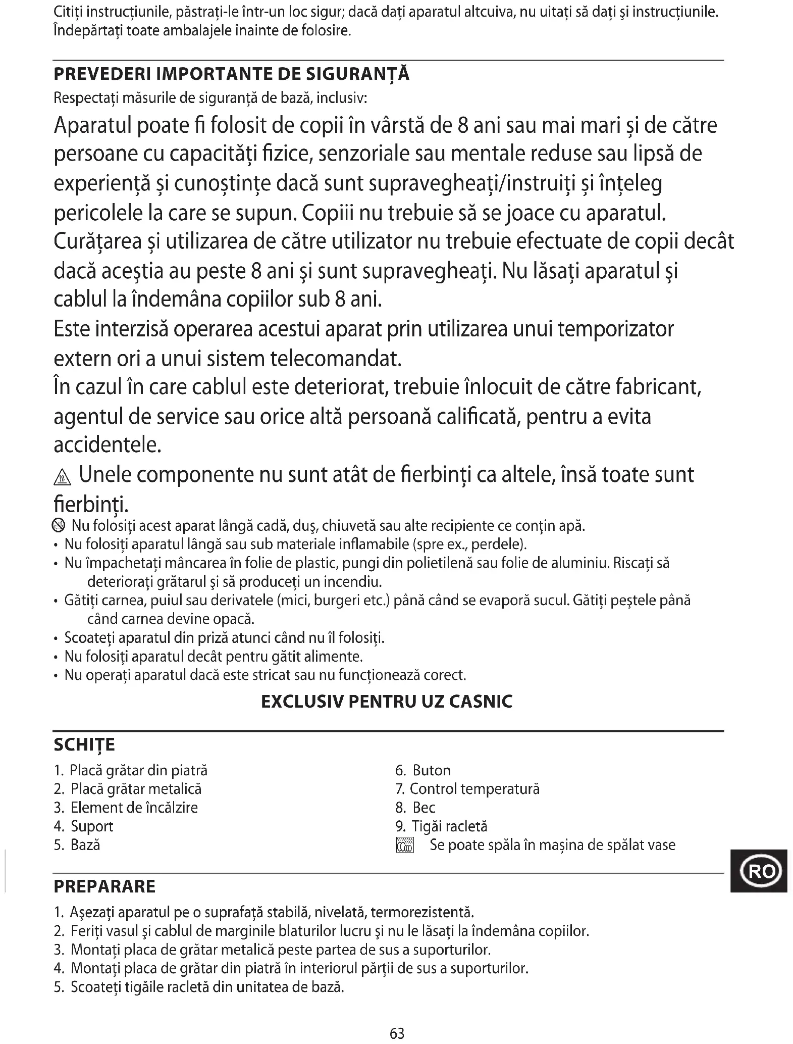 Respectați măsurile de siguranță de bază, inclusiv: Aparatul poate fi folosit de copii în vârstă de 8 ani sau mai mari și de către persoane cu capacități fizice, senzoriale sau mentale reduse sau lipsă de experiență și cunoștințe dacă sunt supravegheați/instruiți și înțeleg pericolele la care se supun. Copiii nu trebuie să se joace cu aparatul. Curățarea și utilizarea de către utilizator nu trebuie efectuate de copii decât dacă aceștia au peste 8 ani și sunt supravegheați. Nu lăsați aparatul și cablul la îndemâna copiilor sub 8 ani. Este interzisă operarea acestui aparat prin utilizarea unui temporizator extern ori a unui sistem telecomandat. În cazul în care cablul este deteriorat, trebuie înlocuit de către fabricant, agentul de service sau orice altă persoană calificată, pentru a evita accidentele. P Unele componente nu sunt atât de fierbinți ca altele, însă toate sunt fierbinți. b Nu folosiți acest aparat lângă cadă, duş, chiuvetă sau alte recipiente ce conțin apă.