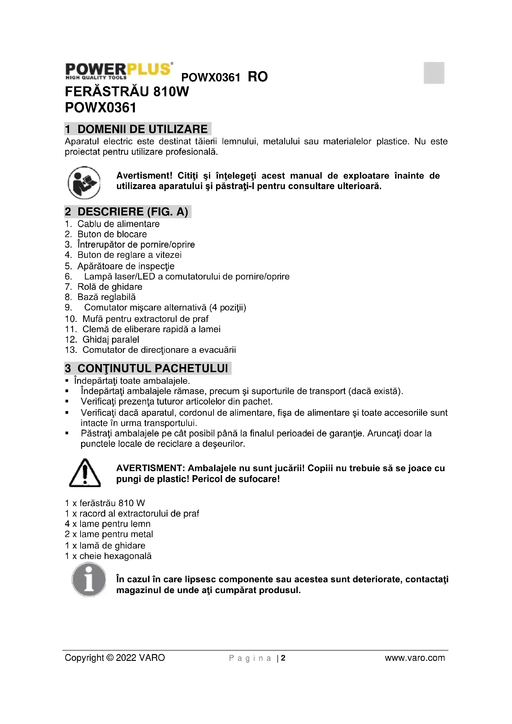 - Păstraţi ambalajele pe cât posibil până la finalul perioadei de garanţie. Aruncaţi doar la punctele locale de reciclare a deşeurilor. AVERTISMENT: Ambalajele nu sunt jucării! Copiii nu trebuie să se joace cu pungi de plastic! Pericol de sufocare! 1 x ferăstrău 810 W 1 x racord al extractorului de praf 4 x lame pentru lemn 2 x lame pentru metal 1 x lamă de ghidare 1 x cheie hexagonală În cazul în care lipsesc componente sau acestea sunt deteriorate, contactaţi magazinul de unde aţi cumpărat produsul.POWX0361 RO Copyright © 2022 VARO P a g i n a | 3 www.varo.com 4 SIMBOLURI În acest manual şi sau pe maşină se folosesc următoarele simboluri: