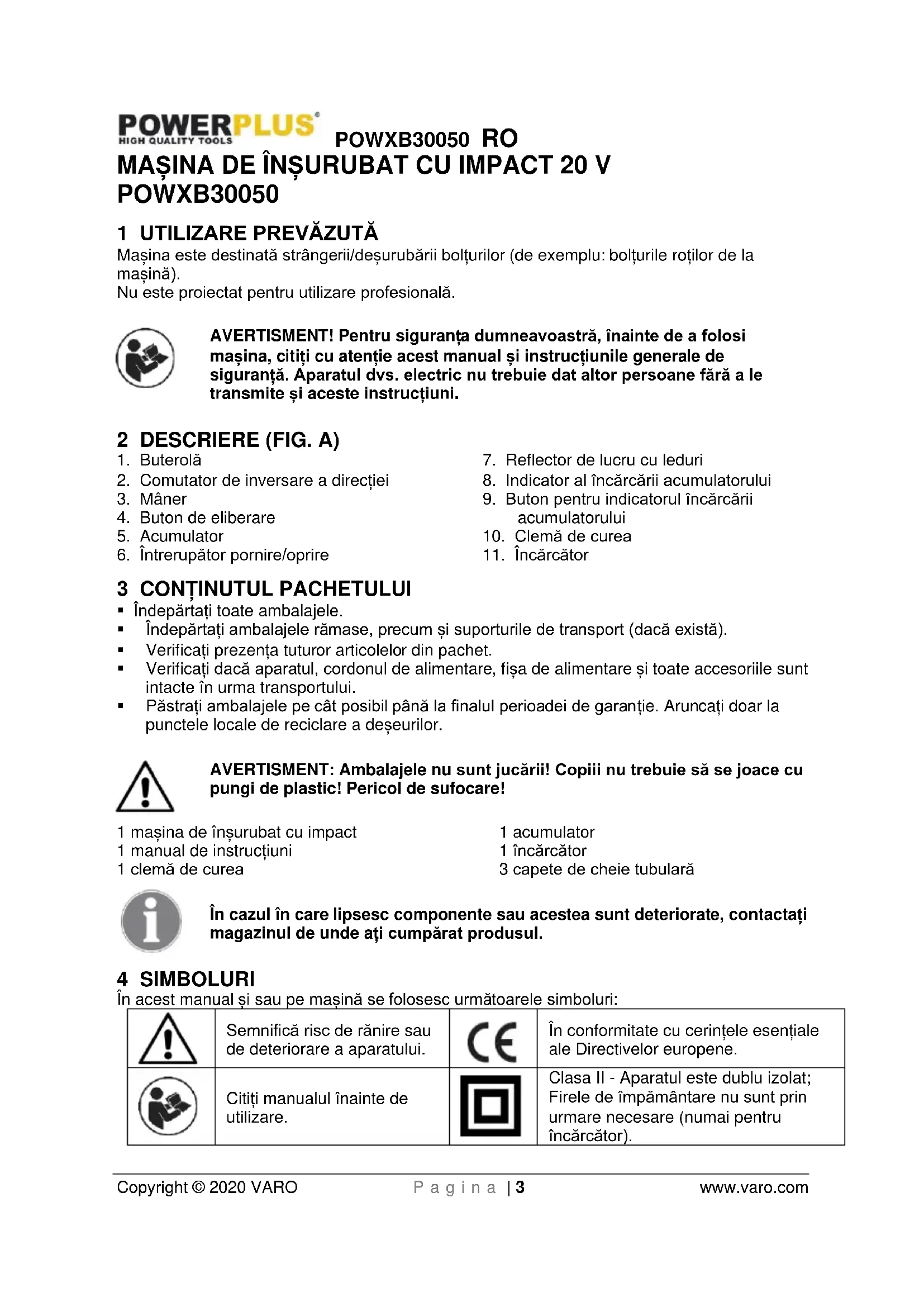 Clasa II - Aparatul este dublu izolat; Firele de împământare nu sunt prin urmare necesare (numai pentru încărcător).POWXB30050 RO Copyright © 2020 VARO P a g i n a | 4 www.varo.com